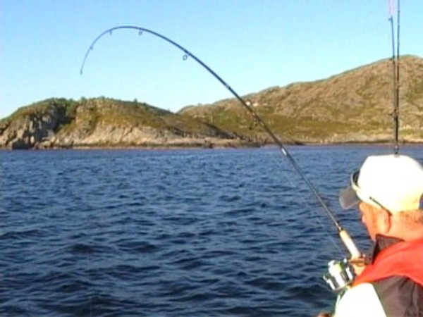 Gegen 20.00 Uhr fuhren wir wieder raus! Da wir von guten Rotbarschfängen an einer Stelle gehört hatten, wurde nun diese Position ins GPS eingegeben und nach kurzer Fahrt dümpelten wir im Windschatten von Hemnskjel an einer steilen Kante von 40 bis 200m! Rotbarschsystem mit kleinen Fischfetzen an Cirkel Hooks bestückt und ab Richtung Tiefe. Durch die tiefe Sonne und kaum Windzug brüteten wir in unserm Boot, allerdings ließen kleine Rucke an der Rute uns froh stimmen. Da war etwas mächtig mit den Fischfetzen beschäftigt. Nach einiger Zeit holten wir hoch….und wurden enttäuscht – Haie!!! An der Hälfte des Harkensystems hingen kleine Dornhaie um die 40 cm…Mist! Ok, das hat keinen Sinn hier, Abfahrt!!! Kurze Drift über ein Plateau, wieder nur Kleinköhler, egal ein paar nehmen wir als Köder mit! Tiefe Rinne gesucht, 180m – sieht eigentlich gut aus hier, also runter mit den Naturködermontagen. Nur ganz wenig Leuchtschlauch dran, einfache Montage mit Flatterfisch! Kurze Zeit später ruckt es ein paar Mal an meiner Rute, „nicht anschlagen du hast Cirkel Hooks dran“ erinnerte mich mein Bruder immer wieder, „warte ab bis er zieht“….! Kurze Zeit später nichts mehr – Köderkontrolle, zerfetzter Köderfisch, sah so aus als wenn sich eine Armada Dornhaie über meinen Köder her gemacht hätten. Weitere Versuche blieben erfolglos! Also noch einmal zur Pollack – Kante, schön wieder starke Strömung und sofort verließen fast bei jeder Drift gute Pollacks um die 85cm ihr Element. Top-Köder ist heute ein langsam absinkender, fingerlanger Gummifisch der meist in der Absinkphase genommen wird. Also doch noch ein guter Tag für uns!