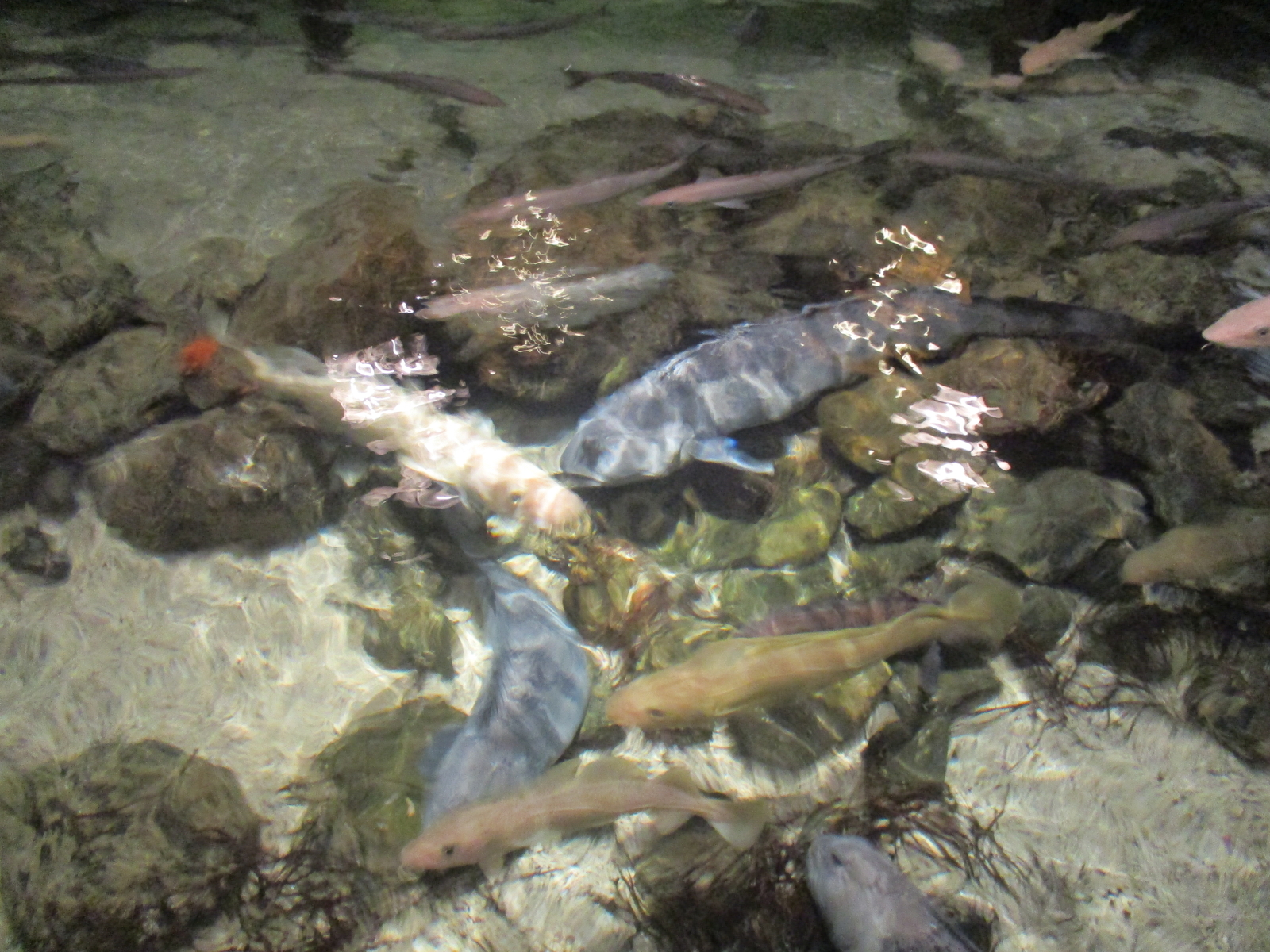 Noch eine Erlebnis Es gab da ein Becken mit großen Seelachsen und auch Steinbeißern in das man von oben seine Hände halten könnte. Ich tat es und tatsächlich konnte ich einen Seelachs streicheln. Davon ermutigt wollte ich dies meiner Frau zeigen und versuchte es noch mal.