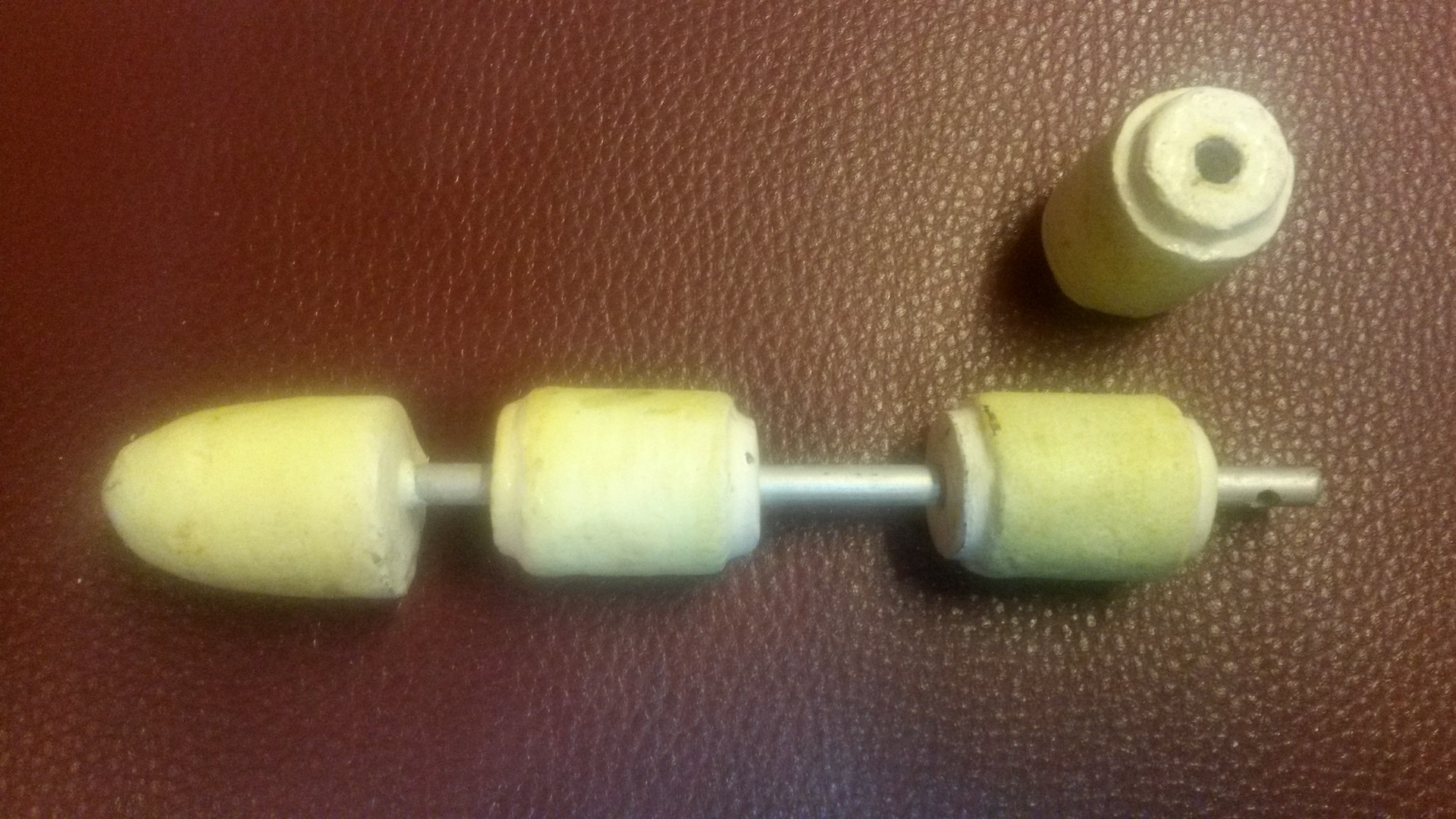 Ob Stab- oderKugelblei, für mich besteht das Problem, dass ich auch beim Natürköderangeln stets so leicht wie möglich zu Werke gehen möchte. Dazu werden dann jede Menge unterschiedliche Gewichte erforderlich. Um das zu umgehen nutze ich daher seit Jahren nur noch den selbstgebauten „Baukasten“ wie im Bild dargestellt. DieAlu-Stange ist im Kopf eingegossen. Es benötigt aber eine formschlüssige Verbindung. Ich säge dazu die Stange einen Zentimeter tief ein und spreize diebeiden Überstände etwas auf.