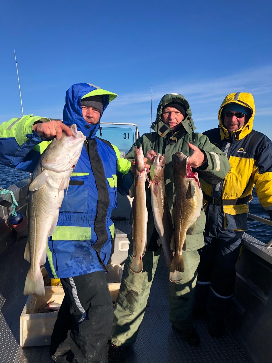 So nun zu heute. Ein klarer Himmel und eisige Temperaturen von -7 Grad begrüßten die Jungs am Morgen. Wie gewohnt standen alle 8 bereits um 7:30 in Booten und machten sich auf zur Jagt. Bei einem traumhaften Sonnenaufgang knallte es auch bald in den Ruten und ein paar schöne Küchendorsche von 70-90 cm landeten in den Kisten.
