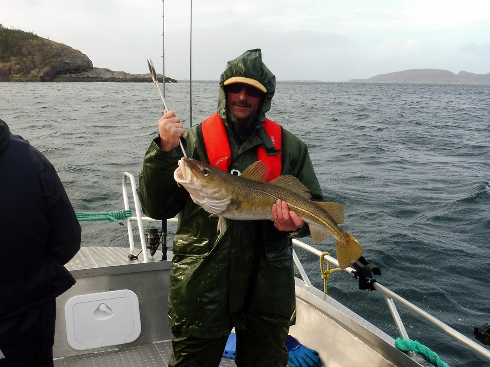 Wir suchten in dieser Bucht östlich von Sandøya Schutz vor dem Wind, aber die Angelei war nicht einfach, da der Wind sich nicht entscheiden konnte, in welche Richtung er uns pusten wollte. Alles war mehr Krampf als Kampf! Als dann auch noch der Plotter samt Echolot ausfiel, beendeten wir das sinnlose Unternehmen. Den ein oder anderen Fisch gab es aber trotzdem. Unter anderen diesen, vom grünen Männchen #zwinker2* gefangenen, hier.