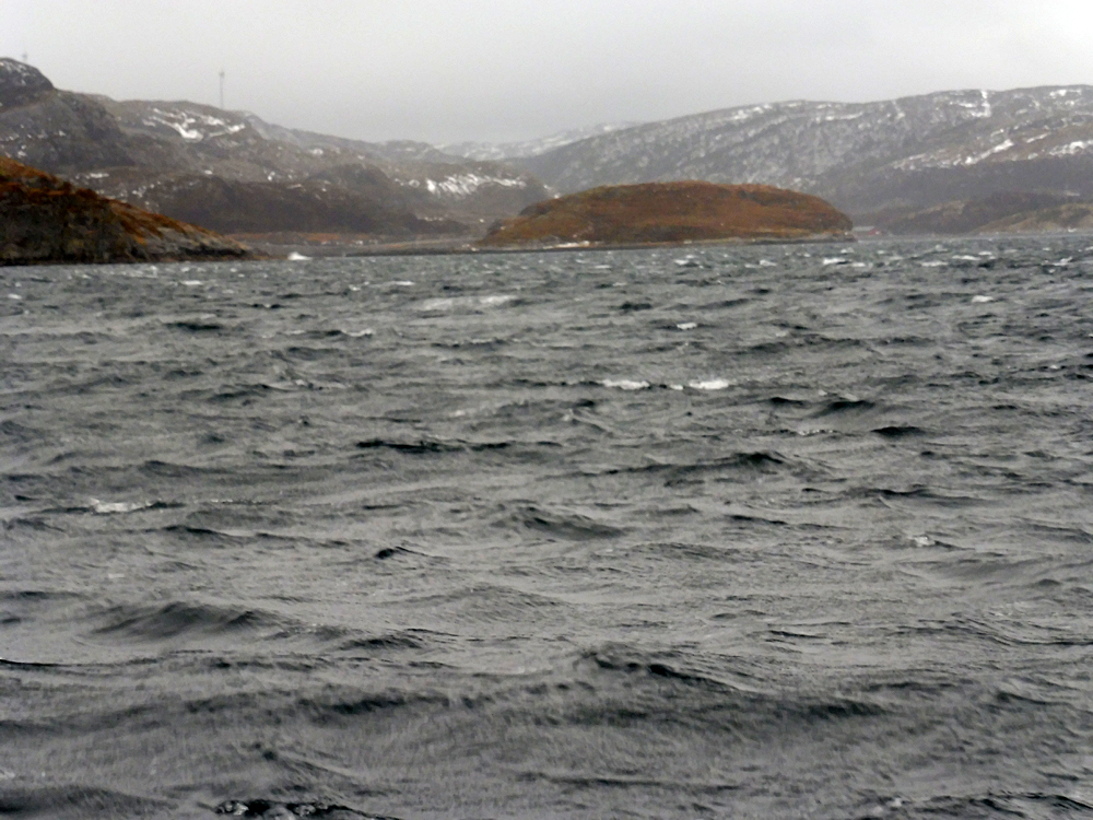 Also wieder rein ins Ölzeug und neuer Versuch. Dieses Mal ging es mit dem Wind im Rücken in den Sørkjerfjorden und einer angrenzenden Bucht. Dass wir abends dann gegen den Wind zurück mussten, wussten wir schon. Aber nicht, dass der Wind trotz anderer Vorhersagen weiter zu nahm. Von der Angelei gib es nicht viel zu berichten. Es gab hier ‚nen Dorsch und auch noch einen zweiten und da mal einen Schelli. Einen Versuch in unserem eigentlichen Zielgebiet brachen wir wegen zu heftiger Schaukelei schon beim ersten Versuch ohne Fisch ab. Als dann das Boot selbst unter Landschutz und mit Treibanker mit über zwei Knoten *eek* übers Wasser pflügte, brachen wir den Quatsch ab und machten uns auf den Rückweg. Gut mit Meerwasser geduscht und durchgestukt (vor allem die Reisenden vorne im Boot) erreichten wir noch bei Tageslicht den Heimathafen. Auf den Bildern sieht das Wetter gar nicht so heftig aus (wir hatten uns zu Knipsen hinterm Stein versteckt) und die Qualität ist leider auch nicht die beste:
