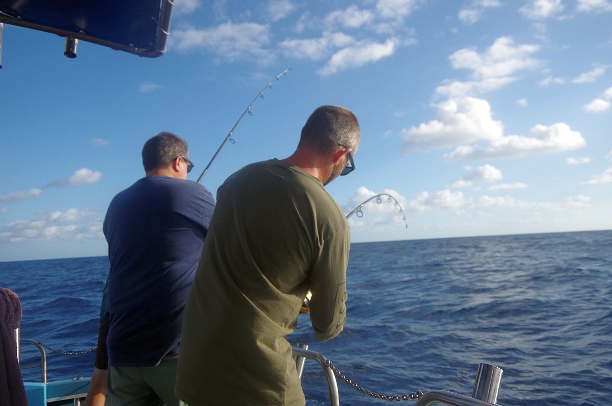 Angelei zu mühselig. Die Jungs stellen die Angel in die Rollenhalter und kurbelten mit der rechten Hand dann wie be-