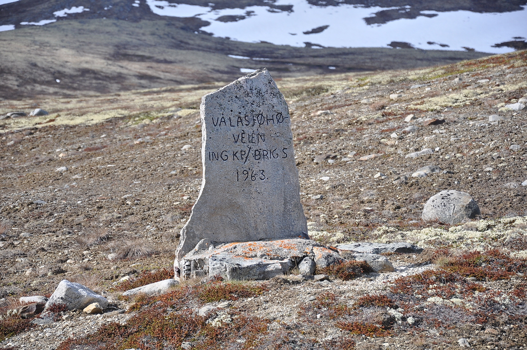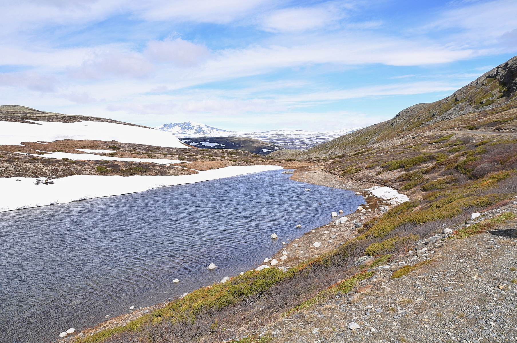 das dazugehörende Gewässer, die Folla, hat tüchtig Wasser. Wir haben dann die Straße, die E6 (nicht wie gestern geschrieben, E16) überquert und sind dann zwischen den zahlreichen Hytten bergan gewandert. Bereits nach wenigen Metern der erste Hingucker: