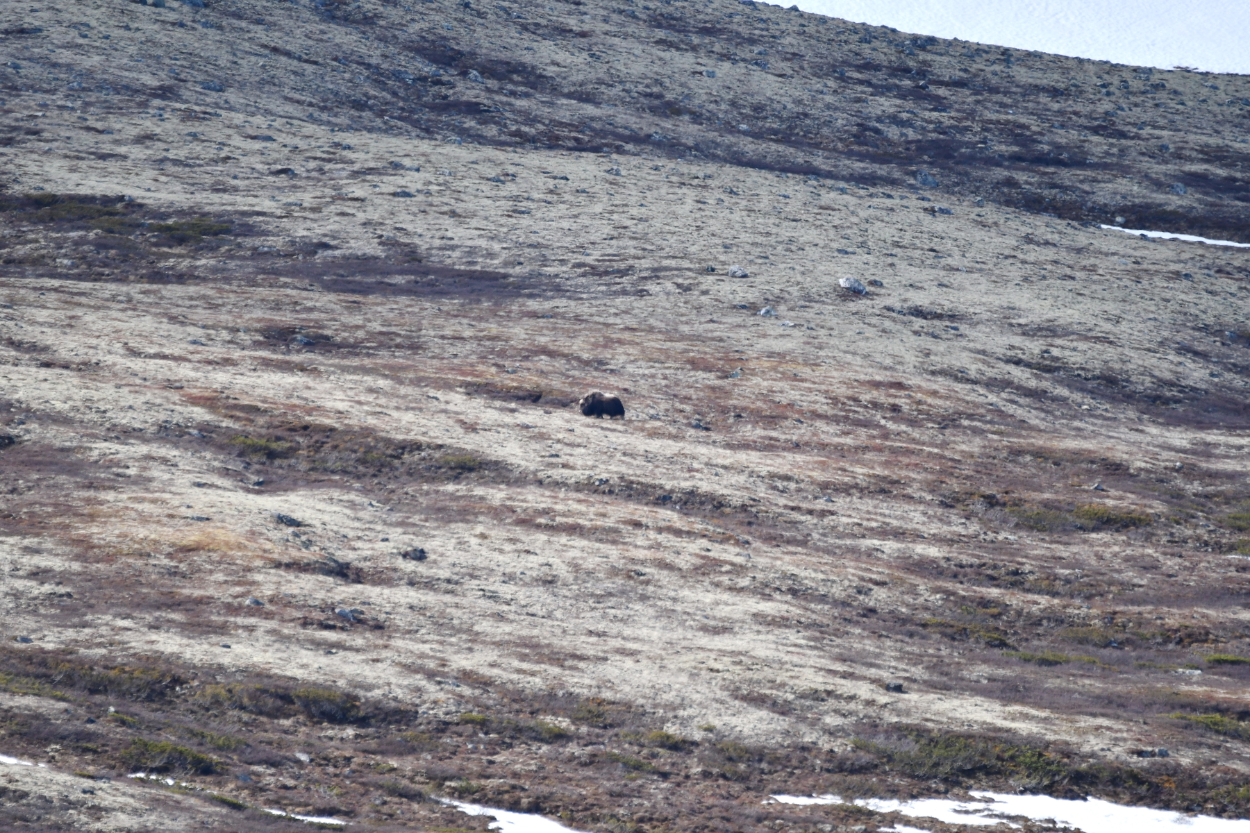 und siehe da - da ist schon ein Moschusochse, aber sowas von weit weg......