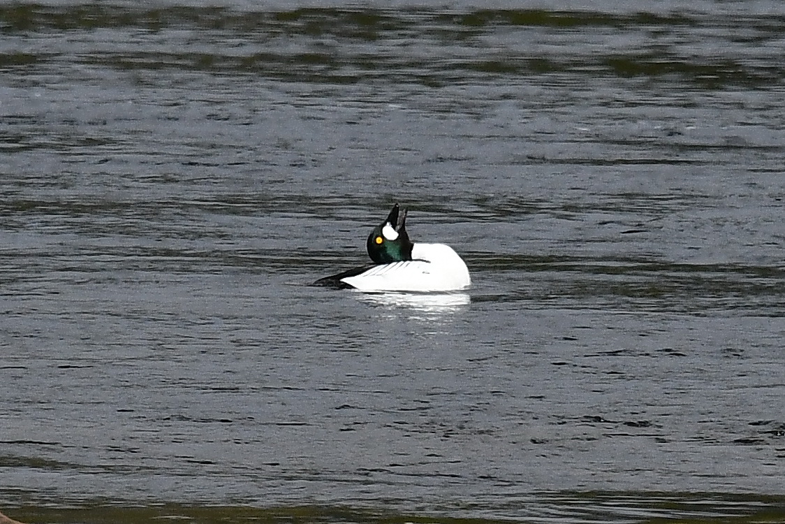 An einem Rastplatz war ein Schellentenpärchen bei der Balz, der Nebenbuhler wurde vertrieben und "sie" schaut unbeteiligt drein .