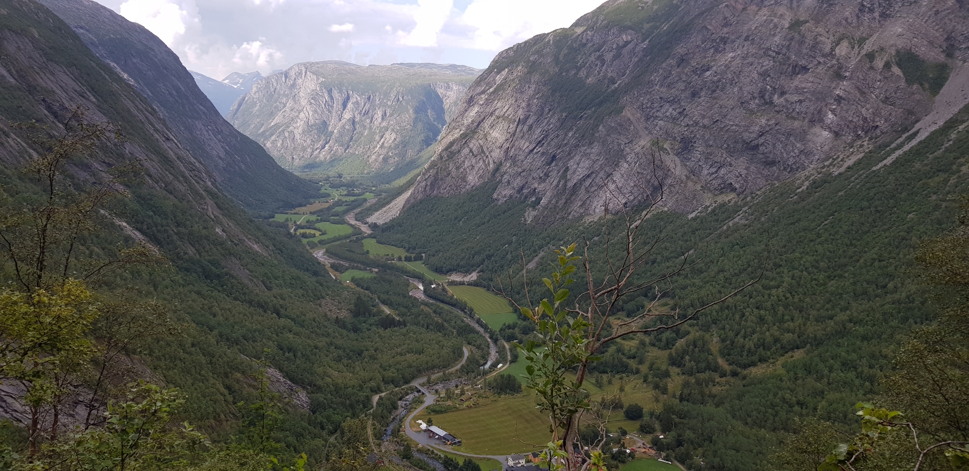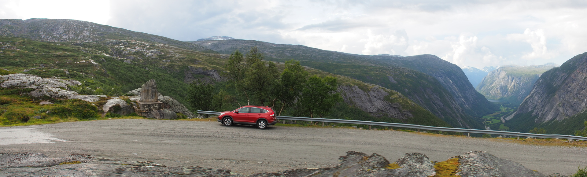 Die Mautpflichtige Straße ( 100 NOK am VISA Automat mit Schranke) beginnt im Tal und schraubt sich stätig Berg auf.