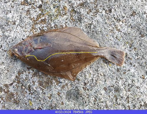 In dem Fall eine Kliesche,gut zu sehen an der Seitenlinie die einen Bogen macht (im Gegensatz zu Flunder und Scholle).