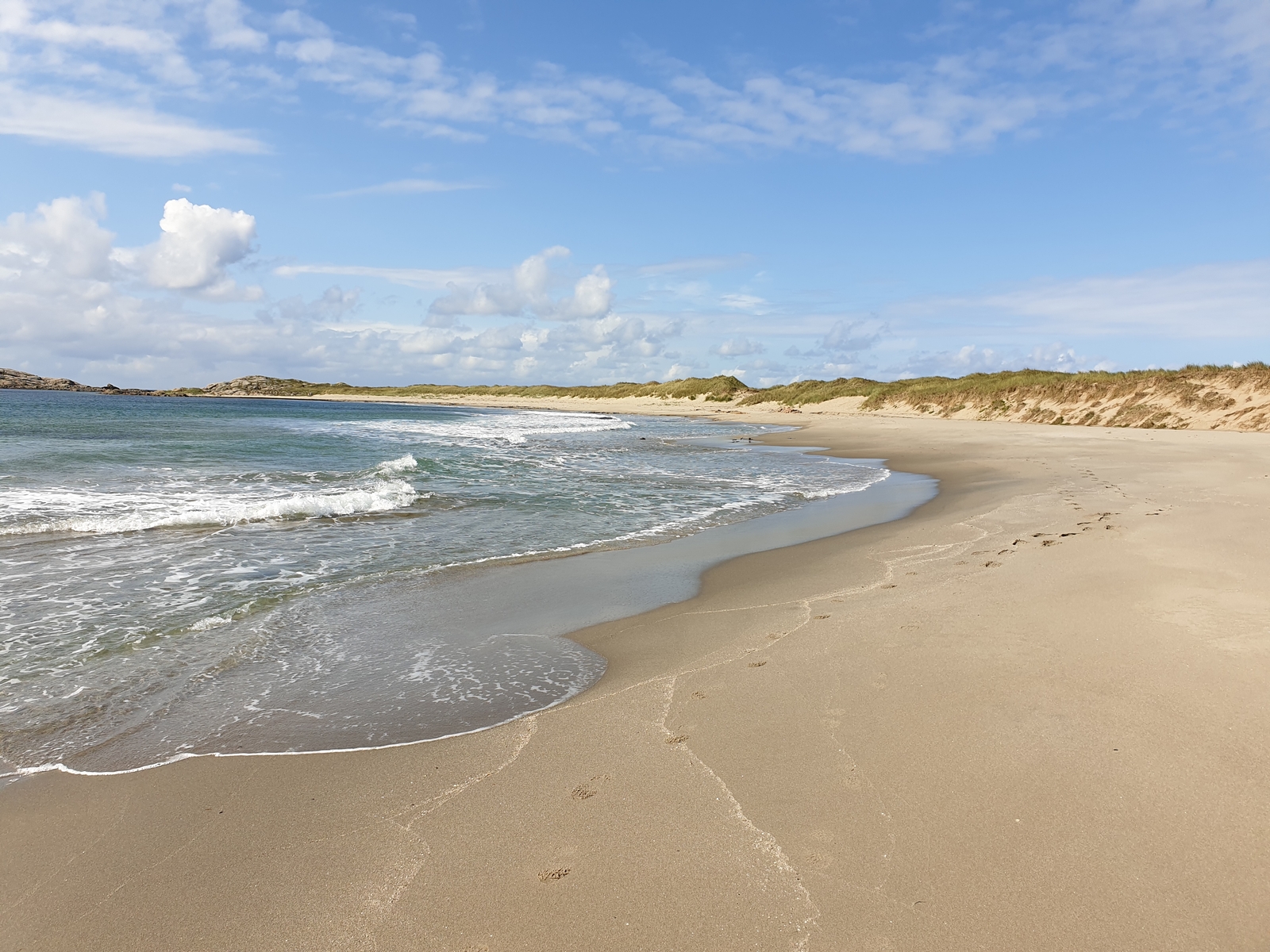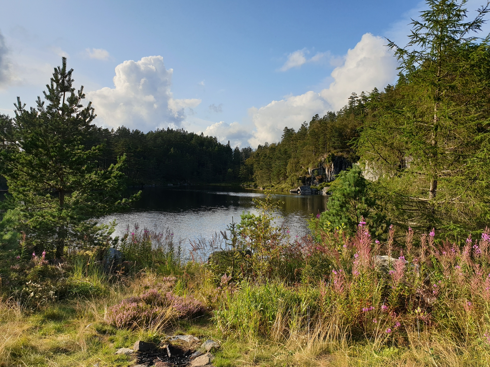 Heute erst so gegen zehn Uhr eine Runde mit dem Boot gedreht. Ist ja schließlich Urlaub. Also ausgeschlafen und in Ruhe gefrühstückt dann ging es los. Hochwasser war gerade rum, aber das war uns egal. Tollstes Sommerwetter, Sonne satt, kein Wind - dafür der erste Sonnenbrand des Urlaubs :) wir sind nur ein bisschen bei uns im Fjord rumgefahren. Auch da gibt es Fisch! Wir haben in kurzer Zeit einen großen Dorsch und einen großen Pollack und 2 ebenfalls große Plattfische gefangen. Immer kaum dass der Köder unten war. In diesem Teil angelt irgendwie niemand, alle fuhren mit Volldampf Richtung Meer, weil das Wetter so gut war. Uns reichte das an Fischen zum Essen, so dass wir zurück gefahren sind. Dann erstmal entspannt in der Sonne Kaffee getrunken und anschließend das Umland erkundet.