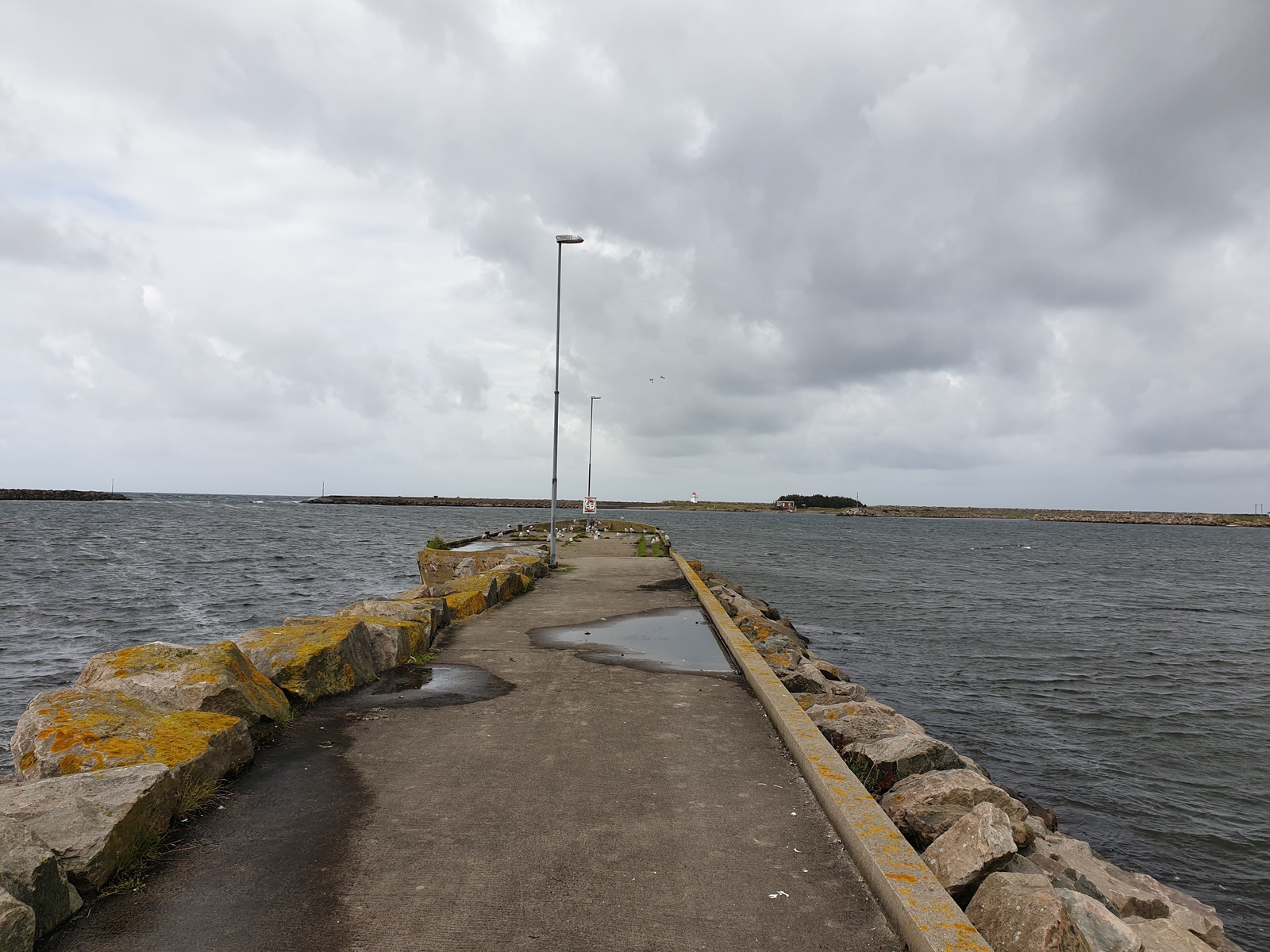 Wie krass unterschiedlich das Wetter sein kann! Richtig Brandung an der Mole, man hat sogar Teile der Wellen abbekommen am Ende der Mole. An Angeln nicht zu denken bei dem Wind! Es waren auch weder Leute, noch Boote noch sonstwas zu sehen. Wie ausgestorben dort. Lag wohl am Wetter dort.