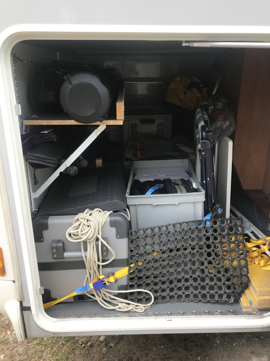 Wohnmobil Garage gepackt mit Angelgerödel.