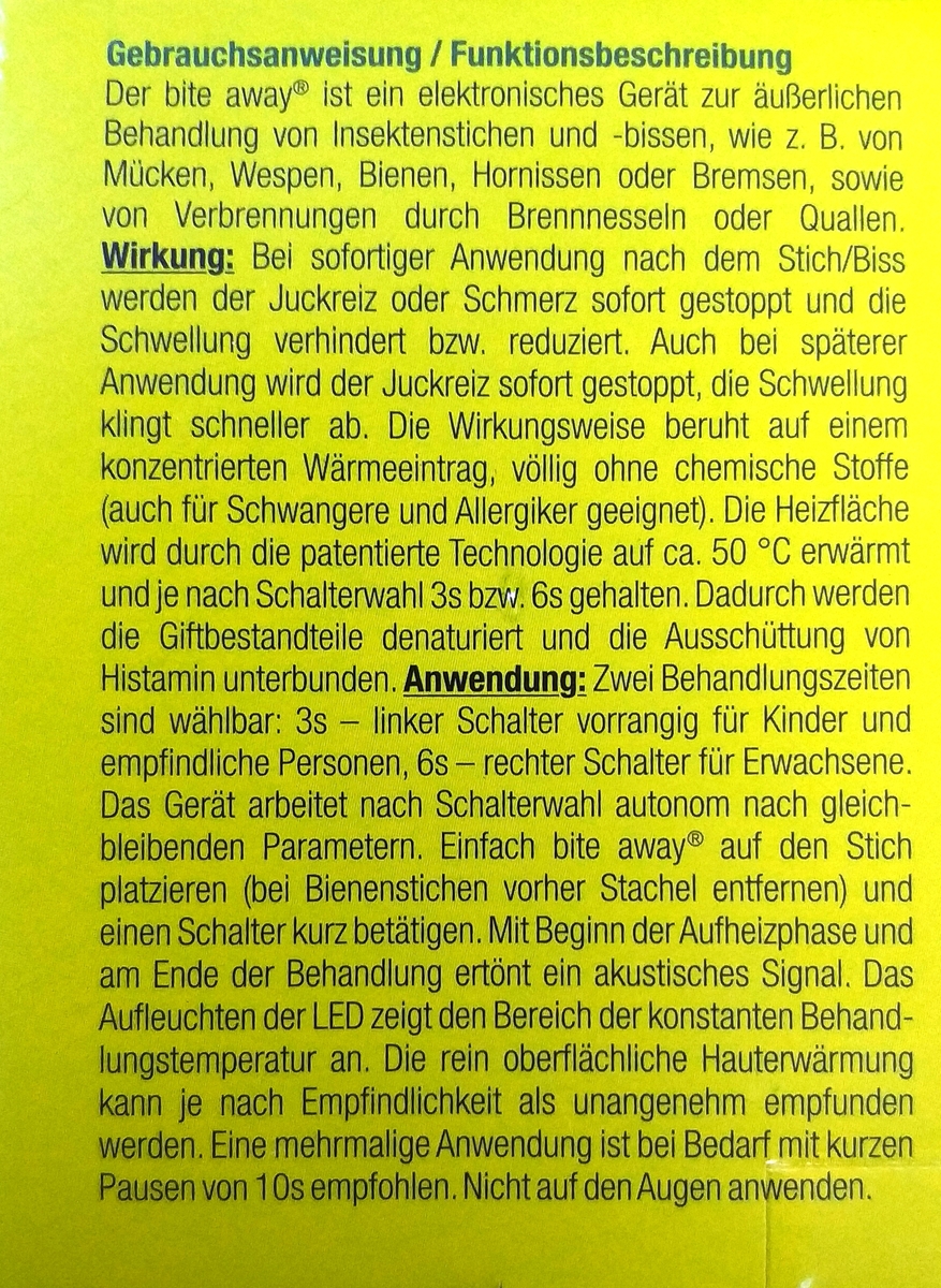 Es gibt ein Gerät, welches mittels Hitze, Mückenstiche dazu bringt, nicht mehr zu jucken. Das klappt tatsächlich, aber die Behandlung kann auch recht schmerzhaft werden.