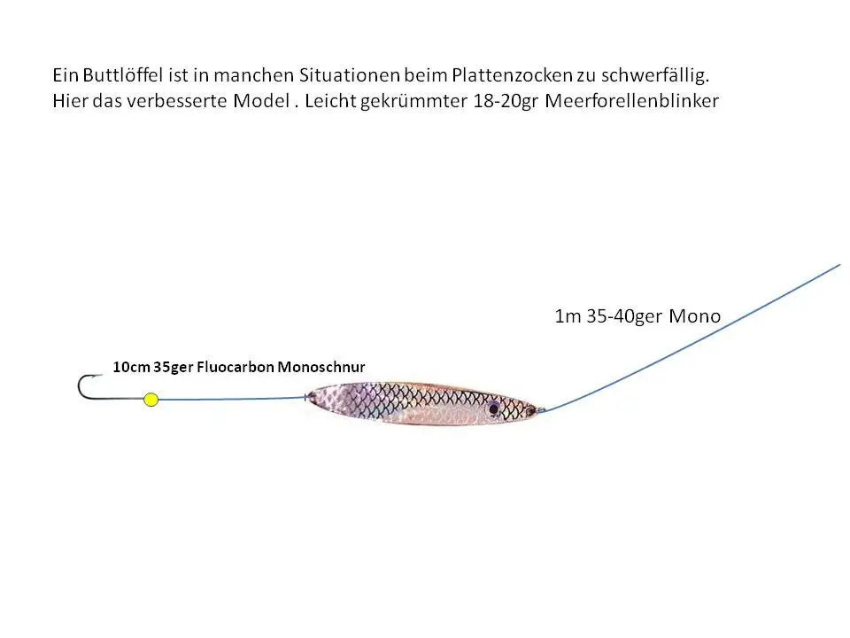 Siehe Skizze. Dieses System sollte man mal mit kurzen harten Rucken, mal mit 3-4 Kurbelumdrehungen mit kurzen Zwischenstopps führen. Der Mefoblinker(genau diesen mi Reflexfolien hatten wir)benimmt sich beim Anrucken wie ein kleiner Derwisch ,hebt vom Grund mit wilden Bewegungen ab ,geht nach rechts und links und macht so meistens auch die beißfaulste Platte hellwach.Man kann das leichte Teil auch in 15-20m Tiefe benutzen, die Absinkzeit dauert zwar etwas länger aber in dieser Zeit kann da auch mal Locker ne Mefo oder ein Poack zuschlagen,das gleiche Passiert übrigens auch mal wenn man den Blinker am Boot wieder nach oben kurbelt:happy:am ,meisten bringt das Teil Spass und Erfolg an ner leichten Spinnrute 20-40gr und 12-15 Geflochtenen.Der große Vorteil ist da man bei diesen Ruten auch den kleinsten Zupfer spürt das man sehr früh anhauen kann und dadurch verschluckte Haken eher selten vorkommen und man Platte die man als zu klein empfindet wieder in ihr Element kommen können.Die Skizze kommt auch in mein Album .