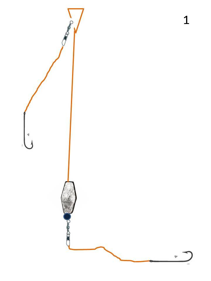 Ich benutze je nach wassertiefe Birnenbleie von 40 bis 100gr .Schnurstärken wie bei Skizze 1 , Als Haken binde ich nur schlanke langschenkelige Butthaken vor die Ich auch hier ein ganz kleines Spinnerblatt setze. Man kann das Vorfach auch weit rausschmeißen und GANZ langsam zu sich heranzupfen mit kurzen Unterbrechungen, Die Bisse sind dann teilweise sehr brachial:D