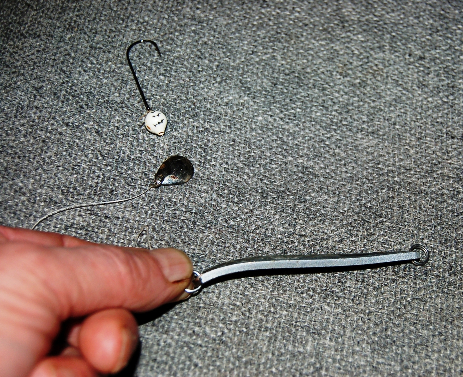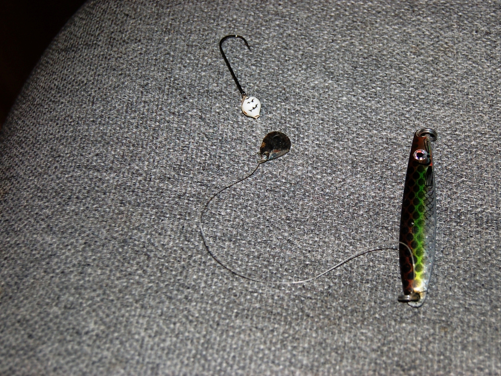 Na, dann zeige ich mal so was ich damit vorhabe,hab das da mal eben auf die Schnelle gebastelt,Schnur ist normale Mono(in echt wirds Amnesia da die härter und steifer ist))etwas zu lang ist das da auch noch .Ein Buttlöffel lockt zwar auch ist meiner Meinung aber zu schwerfällig,wenn man da mit der Rutenspitze einen kleinen Schlag macht hebt er kurz vom Boden ab knallt zurück und erzeugt beim Aufschlagen ne Minisandwolke die locken soll.der Blinker selber sieht schon mal wie ein Minifischchen aus,gibts du dem Teil einen kleinen Schlag hebt der ab wie ne Rakete und taumelt hin und her zum Boden,wichtig ist natürlich ein schön langer schlanker Fischfetzen der da dann wie verrückt hinterher flattert.Frage mal Thomi wenn du wegen nächstes Jahr mit Ihm telenierst wie wir damit unter den Platten im Snigfjord aufgeräumt haben,mehrere Platte auf den gleichen Fetzen und weil die so agressiv gebissen haben wurde sofort angehaun ,nicht eine hatte den Haken verschluckt..alle schön vorne im Maul gehakt so das man alles was einem zu klein erschien sauber vom Haken und zurück setzen konnte.Bringt mit ner leichten sensiblen Spinnrute einen heiden Spaß
