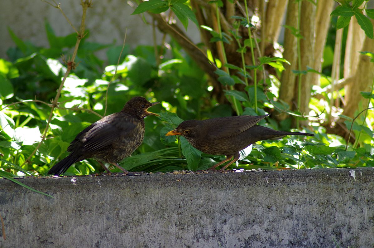 Die "Kleinen" der Amseln sind ganz schön frech und die Eltern müssen die Mäuler stopfen.