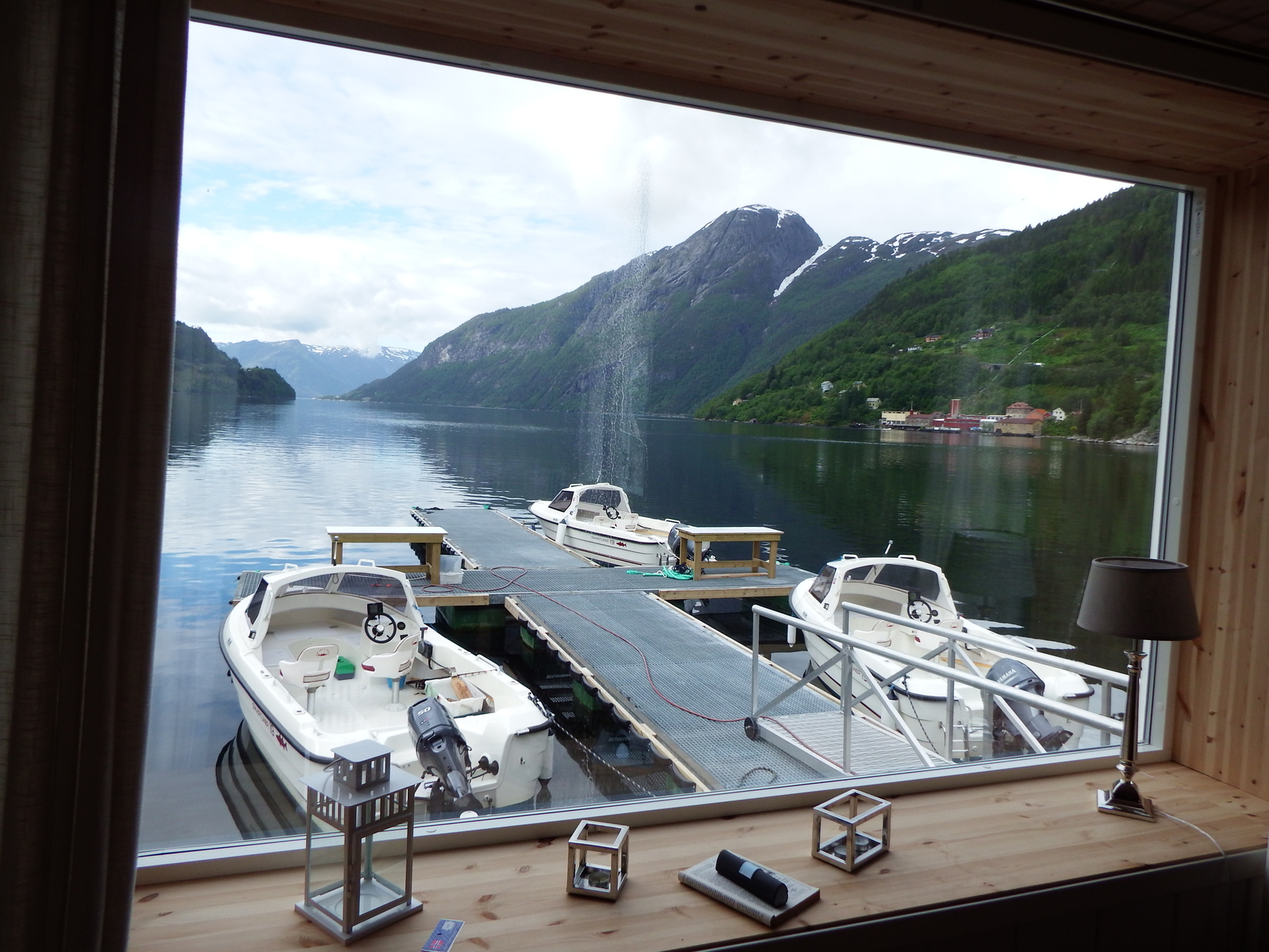 Hier Blick aus dem Panoramafenster über die Anlegestelle auf den Vadheimsfjord in Richtung Sognefjord.Eigentümer des Ferienhauses mit insgesamt 3 (?) Ferienwohnungen ist Borks und die Ausstattung war super