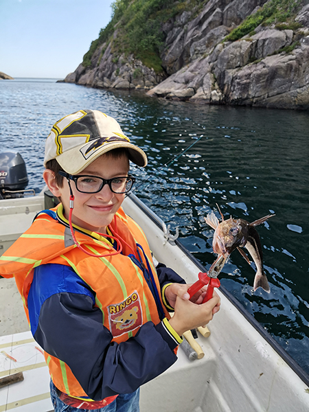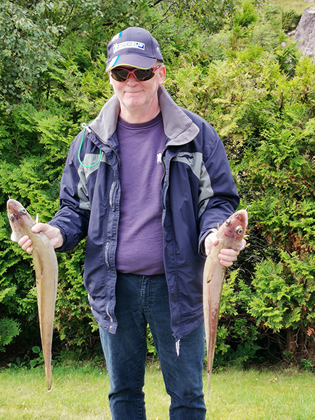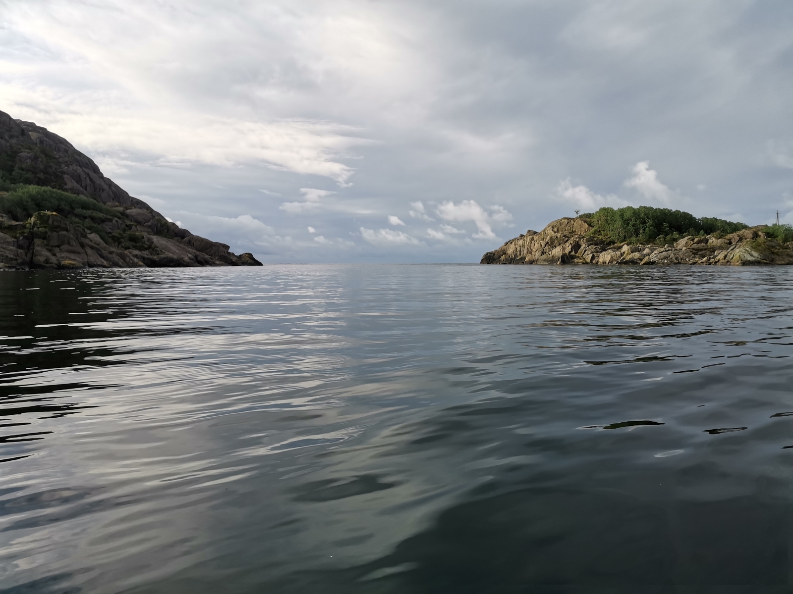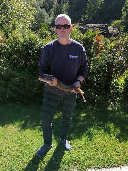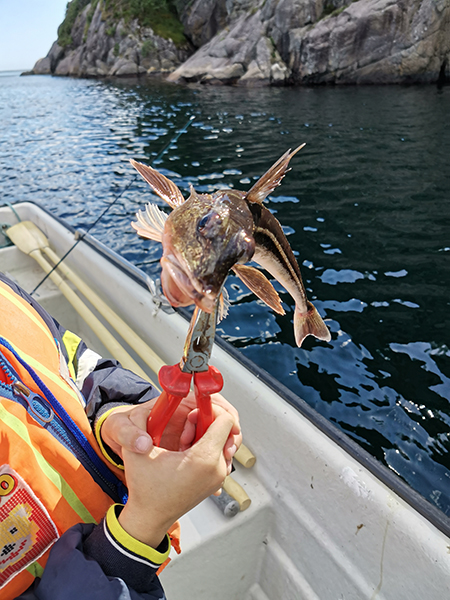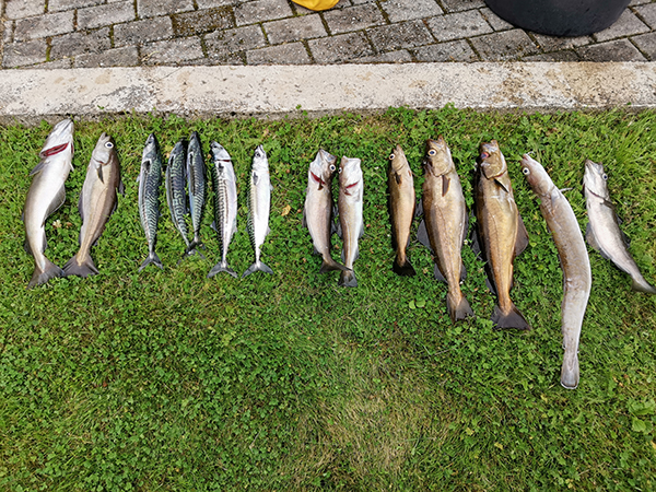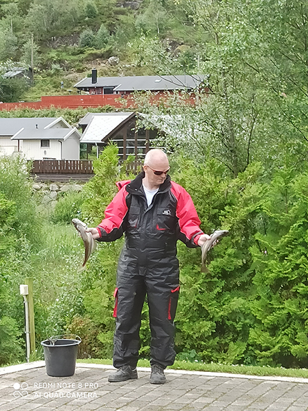 Wir hatten uns für den Hauptfjord entschieden der eine schöne Drift in Richtung Meer hatte (an diesem Tag) je nach Gezeiten und Wetter waren die Strömungen komplett anders. Motor aus und Pilker nebst Vorfach waren unterwegs in Richtung Grund. 1x Auftippen und schon der 1. Hänger, das Vorfach kam zur Hälfte hoch allerdings ohne den Pilker und dem Rest das Vorfachs. An einem anderen Tag holte ich an gleicher Stelle Hanffasern nach oben, also vermuteten wir dass dort ein Tau/Seil am Grund liegt. Bei der Drift im Fjord mussten wir immer die Felsen im Auge behalten. Wir das sind mein Schwiegersohn Marcus, mein Enkel Florian und ich. Drausen auf dem Meer war es ruhig, wenig Wellen. Schon kamen die ersten Bisse (neben dutzenden Hängern, oft Totalverlust) Pollaks, Makrelen und Leng in schönen Größen sowie einige Tangdorsche und jede Menge kleine Fische vom Dorsch bis zum Schellfisch, der reinste Kindergarten. Auch 2 Petermännchen waren dabei, flugs mit 2 Zangen abgehakt und über Bord. Ich hatte eine schöne Pollak-Doublette und etliche Makrelen, Marcus einen Leng, Pollacks, Seelachs und Florian 2 Dorsche und Makrelen. Zum Abendbrot gab es frischen gebratenen Fisch mit Kartoffelbrei und Dillsoße.
