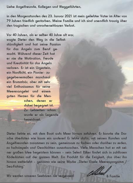 Dieter Eisele ein Pionier der Meeresangelei ist gestorben. Ich werde Ihn als stets aufrichtigen und gütigen voller Ideeen und Visionen erfüllten Menschen in meiner Erinnerung behalten. Ich habe viel zu früh einen guten Freund verloren. Mein Beileid gilt seiner Frau Regina, und seinen Söhnen, möge Gott Ihnen mit Kraft und Zuversicht in diesen schweren Stunden beistehen.