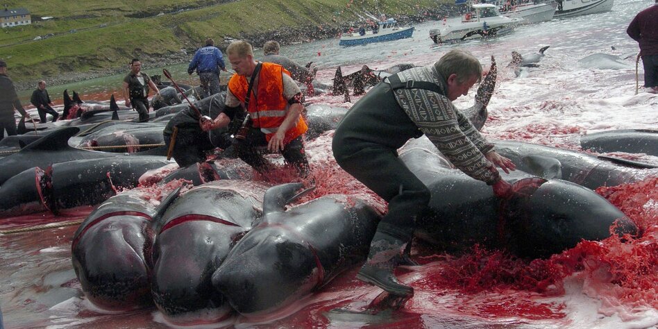 Auf den Färöer dauert so eine Jagd für die Tiere wesentlich länger und ist deutlich brutaler und blutiger, denn sie werden in Buchten getrieben und dort halb auf dem trockenen liegend von Amateuren, die beileibe nicht immer wissen was sie tun und wie sie solch ein Tier zügig erlegen sollten, am Strand regelrecht "zerhackt".