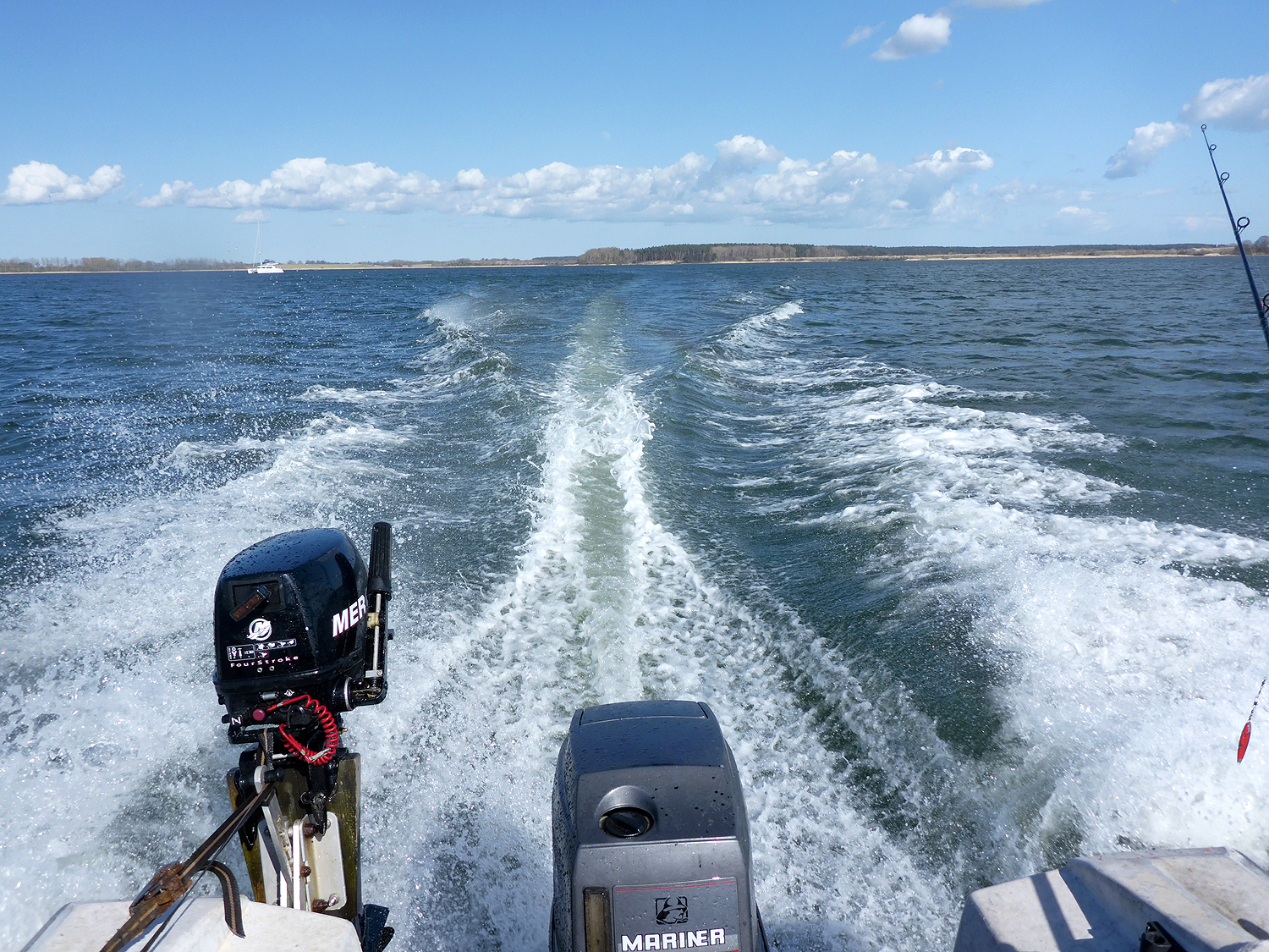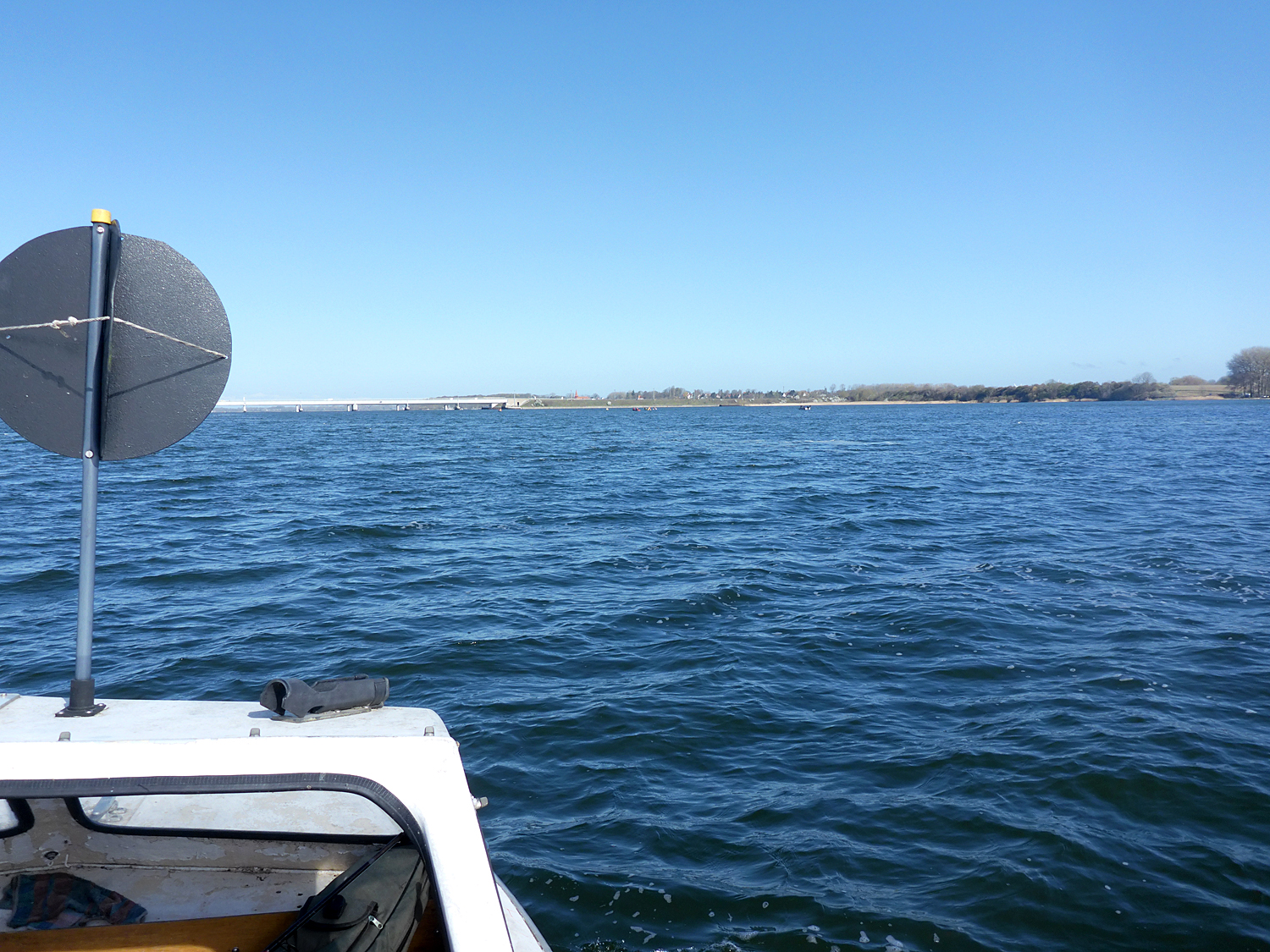 Also rauf auf die Insel und über den alten Damm wieder runter. Das Slippen mit dem neuen Trailer funktionierte gut und so waren wir nach ca. 4 Stunden endlich auf dem Wasser. Die von den Wetterfröschen versprochene Sonne hielt sich etwas zurück und so war es recht frisch auf dem Wasser