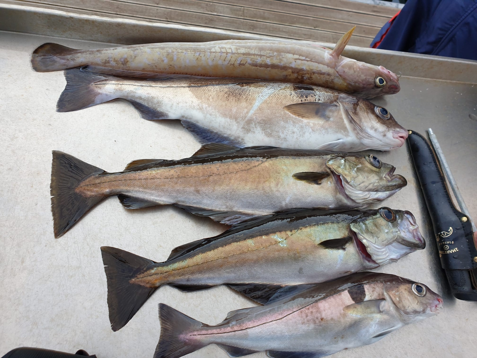 Der Berg ist 5 km entfernt und es dauerte etwas, bis wir da waren. Dann hatten wir 2 x Naturködermontage mit Gewicht und ich hatte Bermannspilker mit rotem Makk und Makrelenfetzen. Ja und dann trieben wir langsam von 40 m bis ca. 100 m Tiefe. Erst hatte Swen einen schönen Pollack, dann fing ich einen Schellfisch. Ulrike hatte plötzlich auch die Rute krumm ein ein ziemlich großer Schellfisch kämpfte mit ihr. Wir fuhren wieder zurück an den Ausgangspunkt und probierten es nochmal. Ein Leng wollte noch mit, ein kleiner Leng durfte wieder rein und dann fing ich mir noch einen Pollack ein.