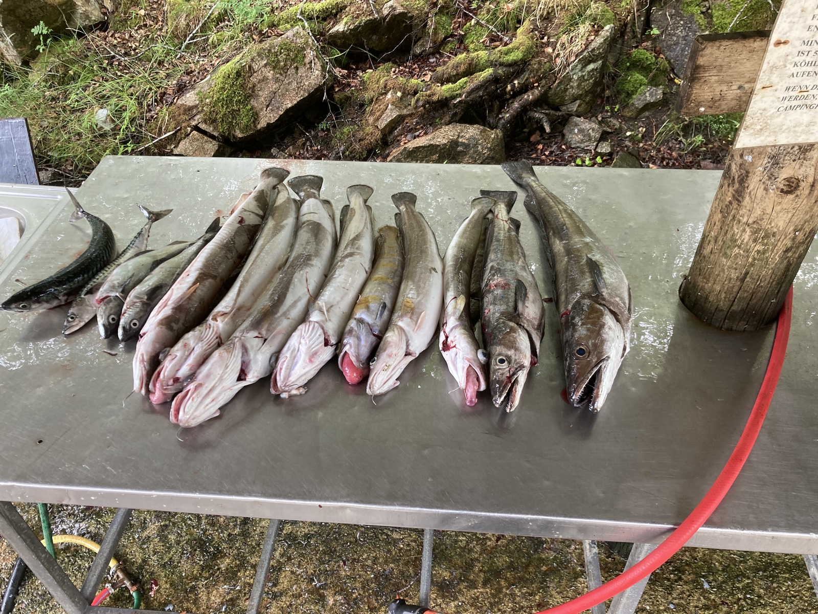 Im gesamt Bild habe ich pollak, Dorsch, köhler, leng, seehecht, den einen Heilbutt und Makrelen und Forellen gefangen.