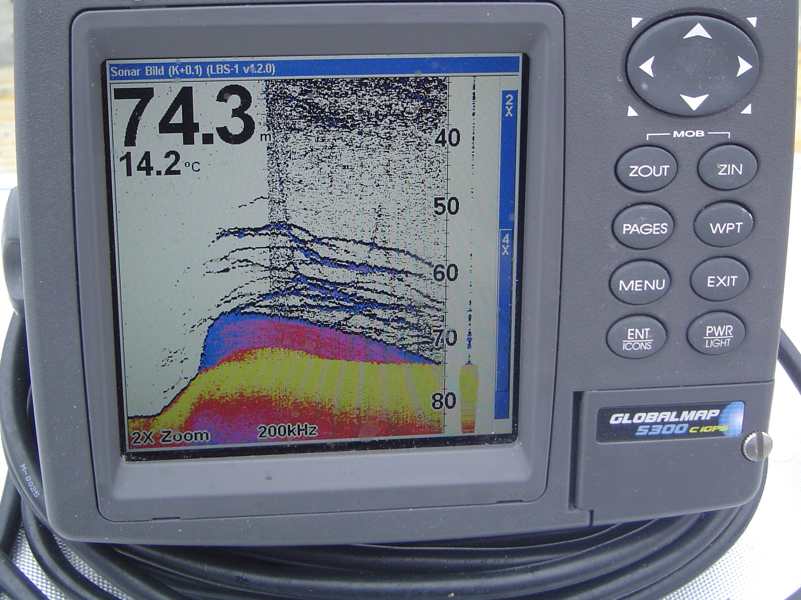 Oft fängt man aber aber auch die grösseren im Freiwasser. Im letztem Urlaub hatten wir dieses Bild auf dem Echolot. Innerhalb 10 Minuten hatten wir 6 Pollack zwischen 65 und 90 cm.