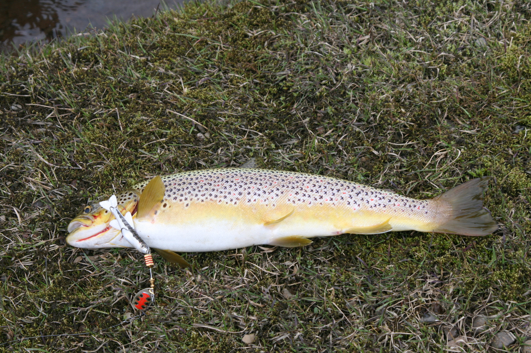 Für einen kurzen Moment , vielleicht für ein oder zwei Umdrehungen, versagt der Spinner seinen ansonsten zuverlässigen Dienst. Das kann keine Grundberührung gewesen sein, denn der Köder bewegt sich eindeutig im Mittelwasser. Der nächste Wurf geht noch einmal exakt in die Richtung des vorherigen. Ich zähle still einundzwanzig, zweiundzwanzig ... fünfundzwanzig jetzt sollte der Spinner die gewünschte Tiefe erreicht haben und ich bringe ihn mit einem kurzen Ruck aus dem Handgelenk erneut zum Rotieren. Weit kommt er nicht! Ein fulminanter Einstieg, der mir keinerlei Chance lässt, einen kontrollierten Anschlag zu setzen, reißt die Rutenspitze herunter und im gleichen Augenblick schraubt sich wild mit dem Kopf schüttelnd etwa dreißig Meter entfernt ein Fisch aus dem Wasser. In hohem Bogen katapultiert die Forelle den Köder aus ihrem Maul in meine Richtung. Die Schnur erschlafft, das war es, ausgestiegen. Verdammt!