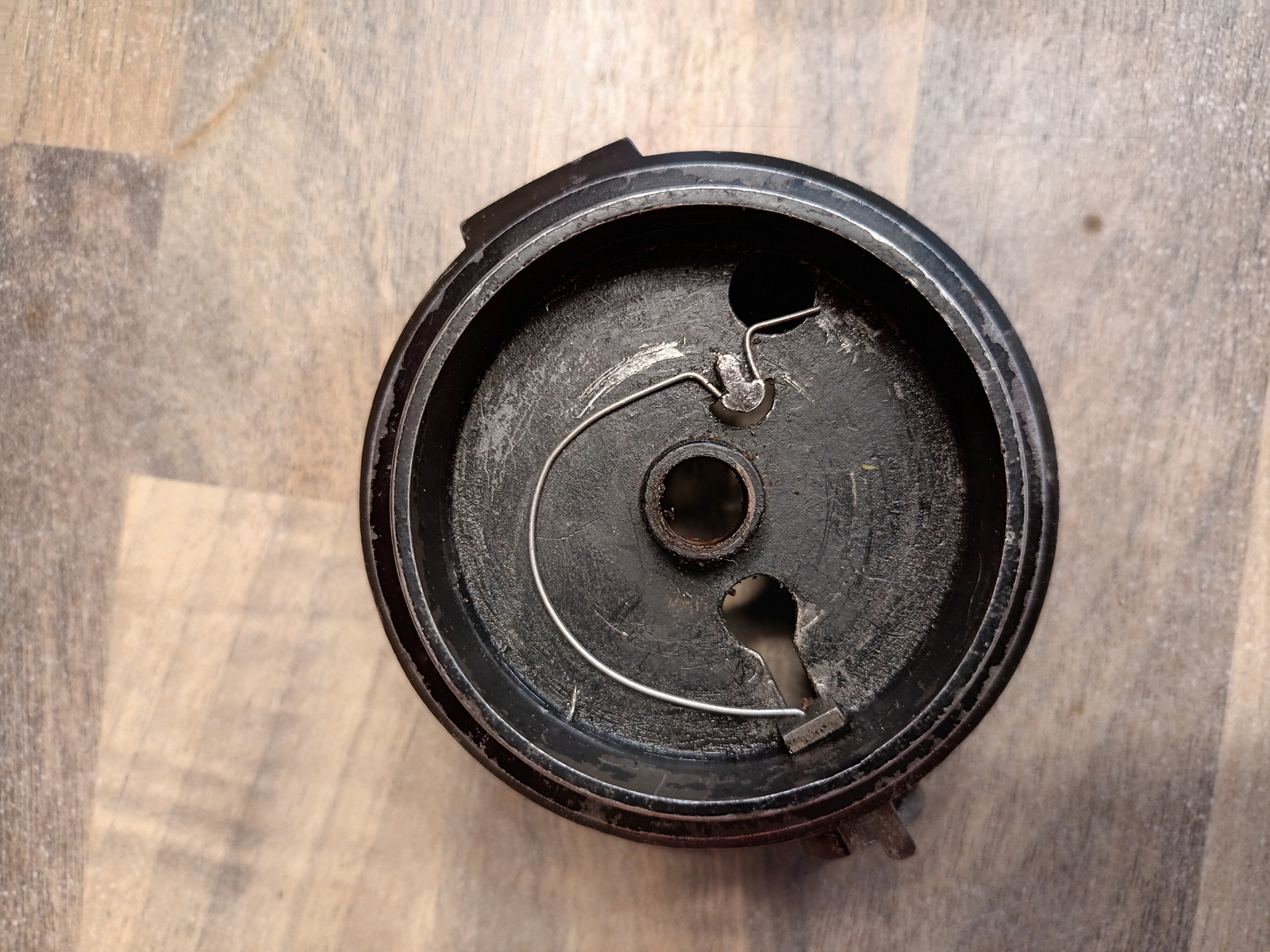 Ich muß die Feder für die Bügelarretierung wieder einbauen, und die ist unterhalb des Rotors zwischen dem Rotor und dem Blech, das die Arretierung des geöffneten Bügels wieder aufhebt. Dieses Teil wird in dem Video nicht zerlegt. Ich glaube inzwischen aber, daß es sich um eine fixe Verbindung handelt und man die beiden Kugellager abziehen muß.