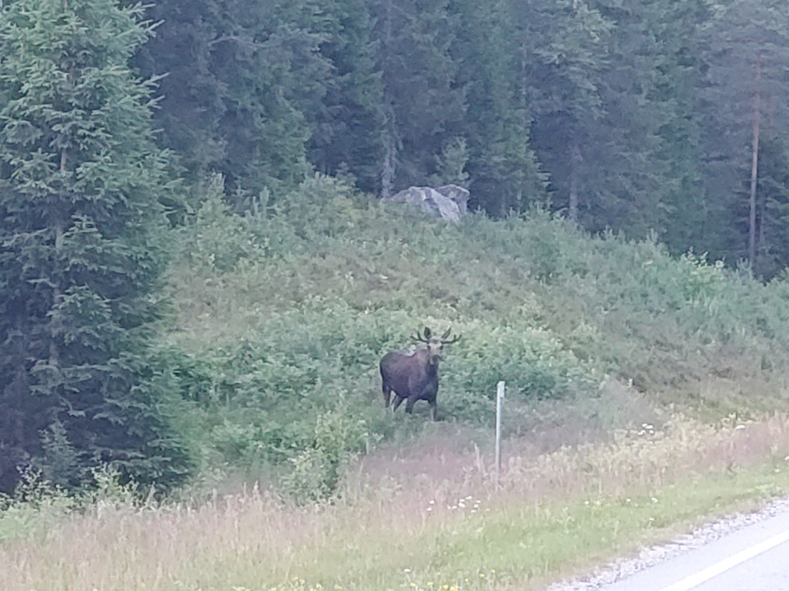 Die Fähre fuhr pünktlich und wir kamen kurz nach 0.00Uhr in Kristiansand an. Zoll... keiner. Also raus aus der Stadt, Parkplatz suchen um etwas zu schlafen/auszuruhen. Gegen 4.00Uhr, mir tat der Rücken weh, beschloss ich weiter zu fahren. Irgendwo zwischen Mosby und Hægeland fuhren wir durch so eine Bilderbuchlandschaft und ich sagte zu meiner Frau...Das glaubt mir jetzt keiner!...die könnten doch einmal, für uns blöde Touris, so einen Papp-elch zwischen die Bäume stellen. Da könnte man wenigstens glauben, einen Elch gesehen zu haben. In dem Moment, wo ich den Satz ausspreche, steht so ein wunderschönes Tier am Straßenrand. Ich glaube es war ein junger Bulle mit noch ziemlich kleinen Geweih. Ich...auf die Bremse, ein Elch...ein Elch und wir konnten sogar einige Fotos machen und eine kurze Video-Sequenz. 8x musste ich nach Norwegen fahren, um meinen ersten Elch zu sehen. Wir waren alle 3 tief beeindruckt.