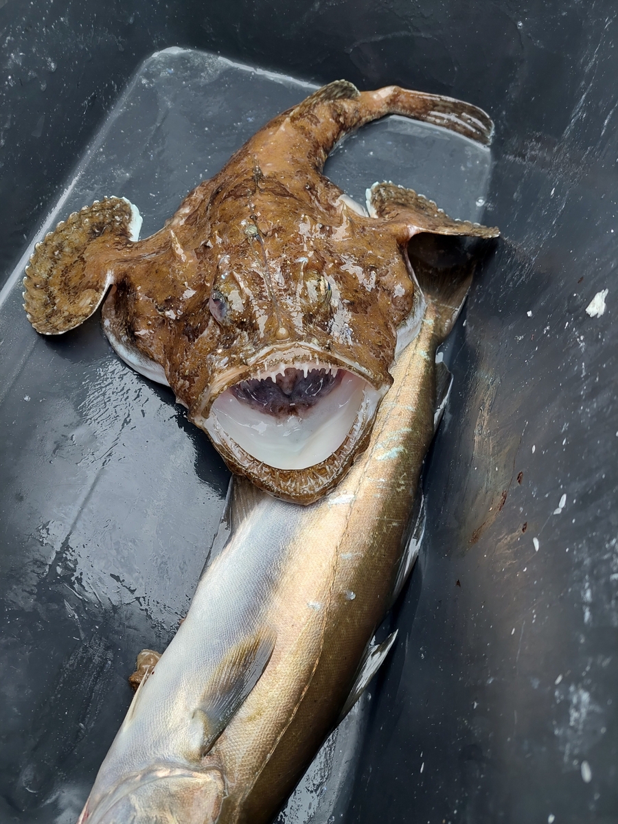 Am 3. Tag ging wieder gar nichts, einige Köder hatte ich schon verloren und dann hatte ich wieder einen Hänger. Der Hänger lies sich aber bewegen und kam mit. Das sollte doch nicht??? Was ich insgeheim gehofft hatte war sichtbar. Ein Seetäufel hatte meinen Köder wohl auf die Birne bekommen und dann inhaliert. Zu sehen war der Köder nicht mehr. Obwohl nicht sehr groß, vielleicht 50cm kam er mit. Am Ende waren es vielleicht 300g Filet. Eigentlich zu Schade.
