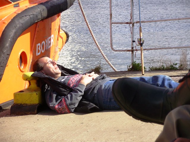 Nachdem ja Tief Peter:mad: unseren Ostseetörn verblasen hatte stand für uns eigendlich ausser Frage das wir uns dadurch den Tag auf keinen Fall vermiesen lassen:baby:Also wurde umdisponiert und das Gründungstreffen:biglaugh: an die Rehtehubbrücke verlegt.Um 7 Uhr waren dann auch fast Alle vor Ort(ausser Mitglied Lundi ,der schwitzte noch bis 11 :30 Uhr seine Erkältung aus:biglaugh:) ,auch unser Nuddelsalat plus Daggi trudelten um diese Zeit ein:klatsch:Neben uns angelte noch ein Pärchen von dem auch bald der erste Zander auf die Planken gelegt wurde,cirka 80cm und ein wahrer Prachbursche(Foto folgt später) Bernd hatte den ersten (und auch einzigen Aal:baby:.Nachdem Lundi schon im Voraus angekündigt hatte (wenn ich komm kommt Fisch:biglaugh::baby:) wurde mit meiner Rute (aber nicht von mir:D) auch der erste Team Zander gelandet , auch ein Brassen (Fetzenköder )durfte aus dem Wasser.Dann wurde erstmal der Grill angefeuert und diverses Fleisch( danke Martin:baby:) und Würste( Danke Bernd :baby:)plus Nuddelsalat(Danke :kuss:) wanderten in hunrige Mägen. Zwischenzeitlich fürten wir erste Verkaufsgespräche mit dem Kapitän des Verholerbootes das dort am Anlieger liegt(Lasse hatte sich verliebt:D:D)und träumten davon es nach Norge zu überführen:D:D erst als uns der Kapitän die techneischen Daten näherbrachte kam die Erkentnis das 60 l Diesel die Stunde ,30 tonnen Gewicht und 2,50 Tiefgang dann wohl doch etwas (aber nur etwas:cool:) über unsere Finanzen ging:D aber wir träumten weiter:happy:( Filmchen ) am nachmittag bekammen wir Besuch von diversen älteren Mitgliedern der Polizei die eine Rentnererbootsfahrt duch den Hafen machen wollten so mit kaffee und anderen Leckerein,Was braucht man zum Kuchenschneiden???:),richtig ein Messer:baby: und das war an Bord nicht vorhanden:D also tätigten die Herschaften ein Mietgeschäft mit uns ,Messer gegen 10 Bierchen Leihgebühr(das Bier wurde uns förmlich aufgedrängt:baby:).Um sich noch näher (geht das eigendlich) kennen zu lernen wurden Gespräche geführt und diskutiert:D