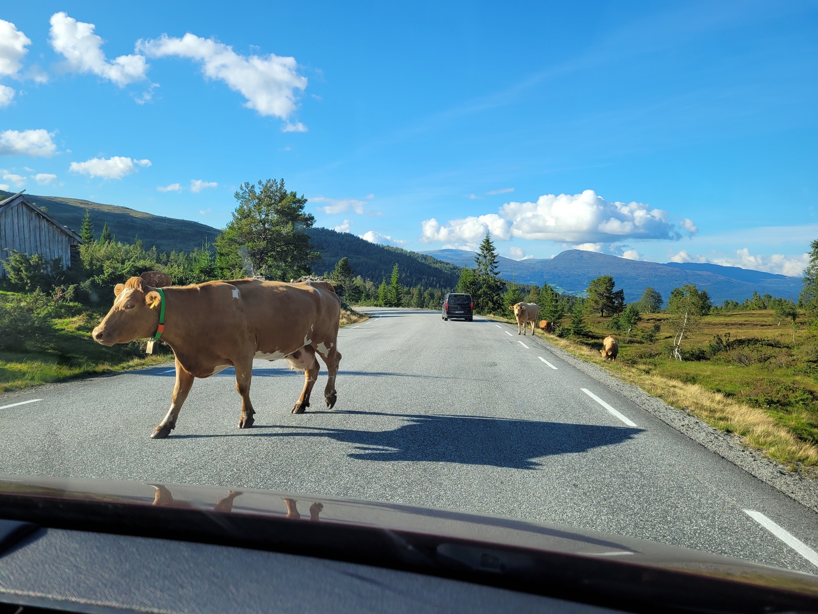 Bei Norwegen denke ich zuerst an Elche, aber irgendwie haben Sandra und Rolf auf der ersten Etappe sich mit einer Kuh angelegt: