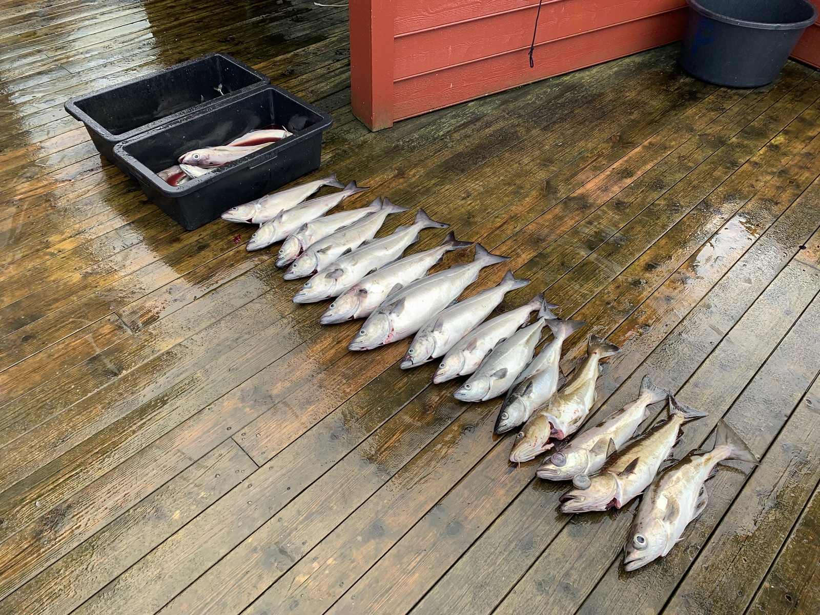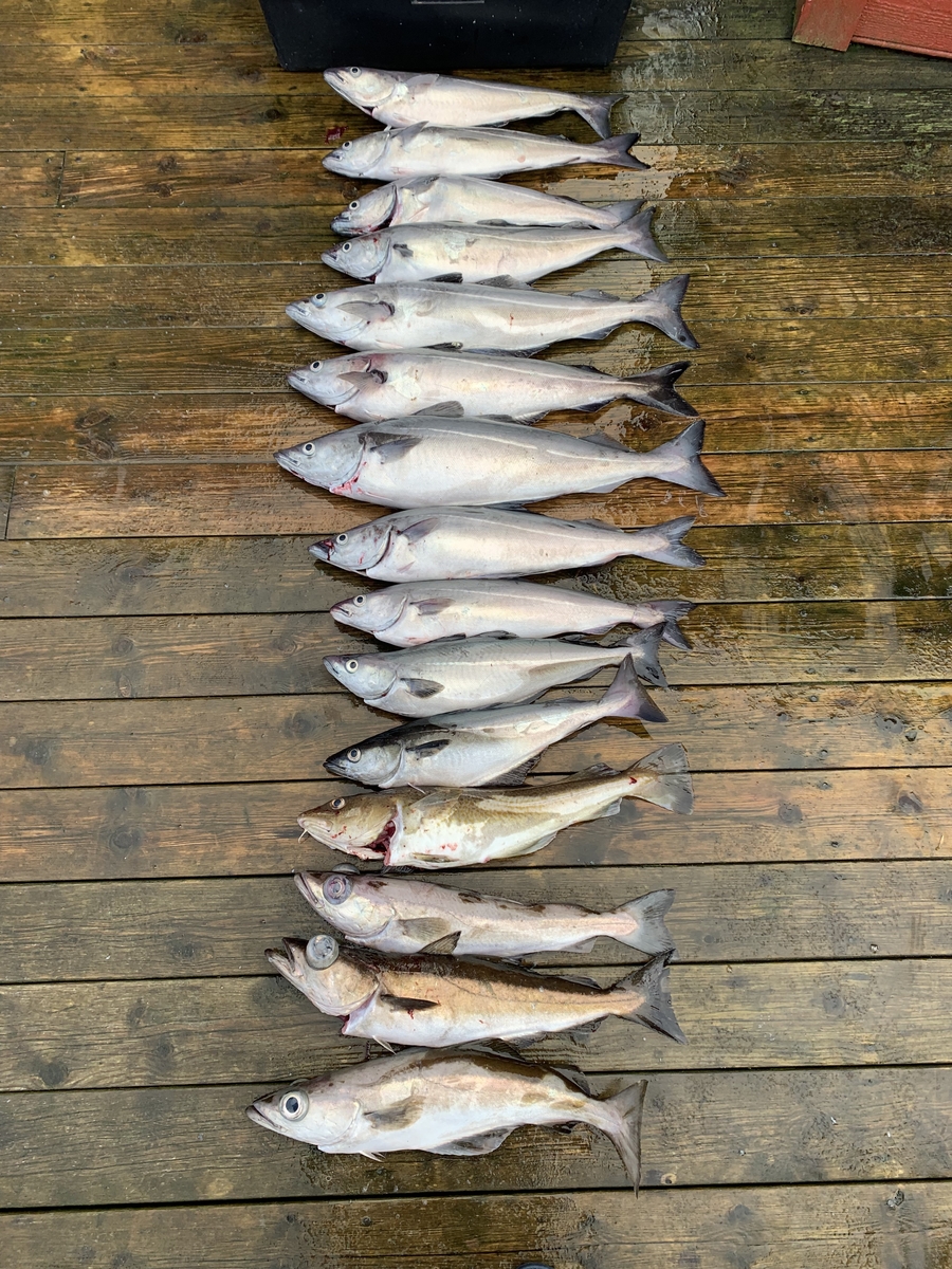 Wir drifteten mehrmals über die Stelle und konnten einige Seelachse und Pollacks verhaften. Auch Makrelen waren reichlich da, die uns das Angeln auf den Seelachs sehr erschwert haben. Doch wenn wir es durch die Makrelen geschafft haben, lief es sehr gut.