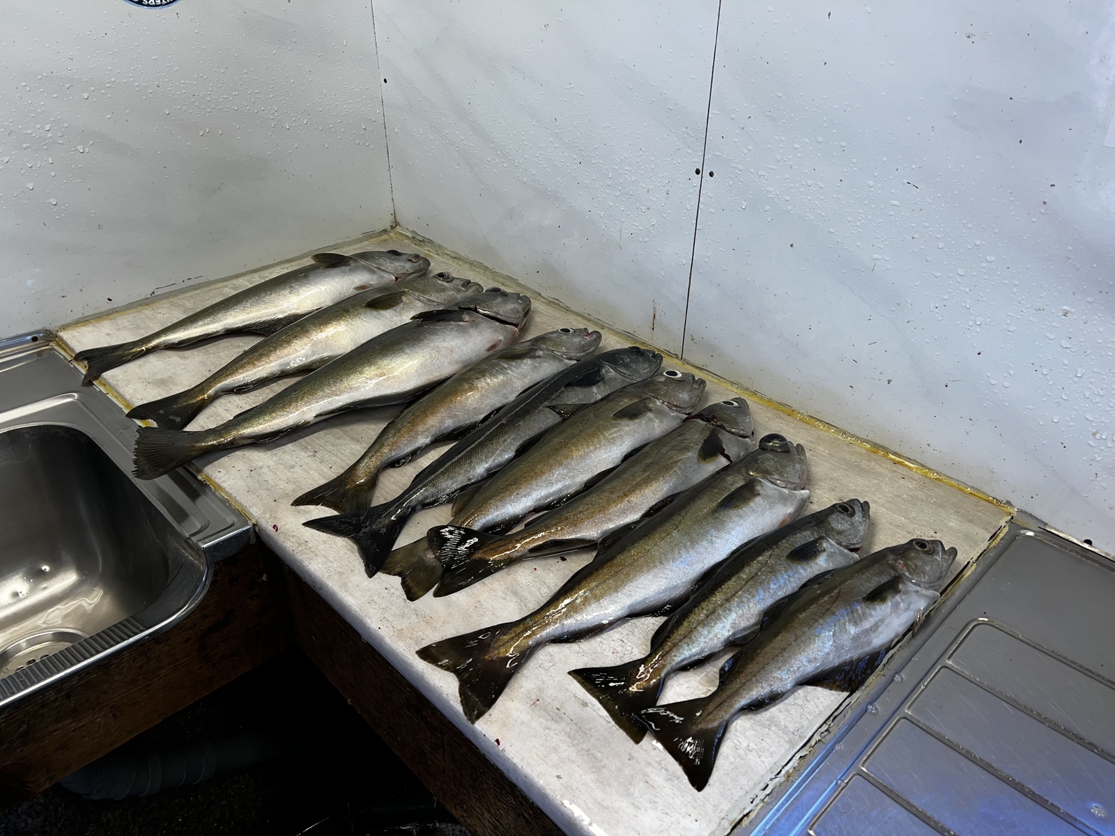 Gegen 13 Uhr machte sich eins unserer Boote dann raus aufs Wasser. Wir wollten mal schauen wie die Wellen sind und wie stark der Wind dort draußen bläst. Und tatsächlich war es nicht so schlimm wie erwartet und wir konnten etwas weiter rau und dort ein paar Berge abfahren. An einem Berg wurden wir fündig und konnten ein paar Seelachse und Pollacks ins Boot befördern. Dann drehte der Wind etwas und auch die Wellen kamen anders. Mehr aus Richtung Süden und deutlich ungemütlicher. Somit entschieden wir uns, wieder weiter in die Scheren zu fahren. Dort haben wir es nochmal auf einzelnen Bergen versucht, konnten aber nichts an die Leine bekommen.