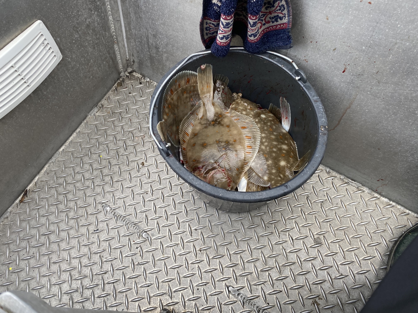 Wir sind wieder an Land. Haben jetzt 7 - 8 m/s. Welle ist ok, aber mehr als 3 km/h Drift. Mit Buttlöffel kaum runterzukommen. Am Besten haben wir heute zwischen 4 bis 6 m die Platten gefangen. Gut 75 Stück sind es zu viert geworden. Überwiegend Scholle, dann Flundern und wenige Klieschen. Keinerlei Beifang.