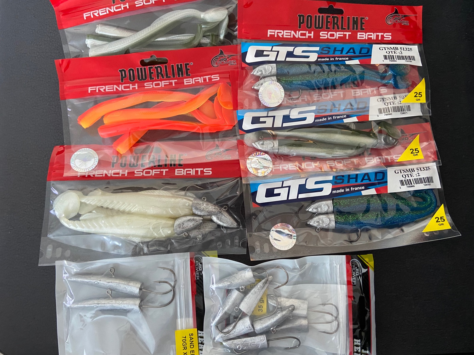 Des Weiteren habe ich noch Gummis und Jigköpfe vom französischen Hersteller „Powerline“ dabei, wo die Cousine meiner Frau arbeitet. Diese sind überwiegend nicht UV-aktiv, außer den orangen. Auch diese werde ich testen, dann bekommen wir auch einen direkten Vergleich UV oder ohne.
