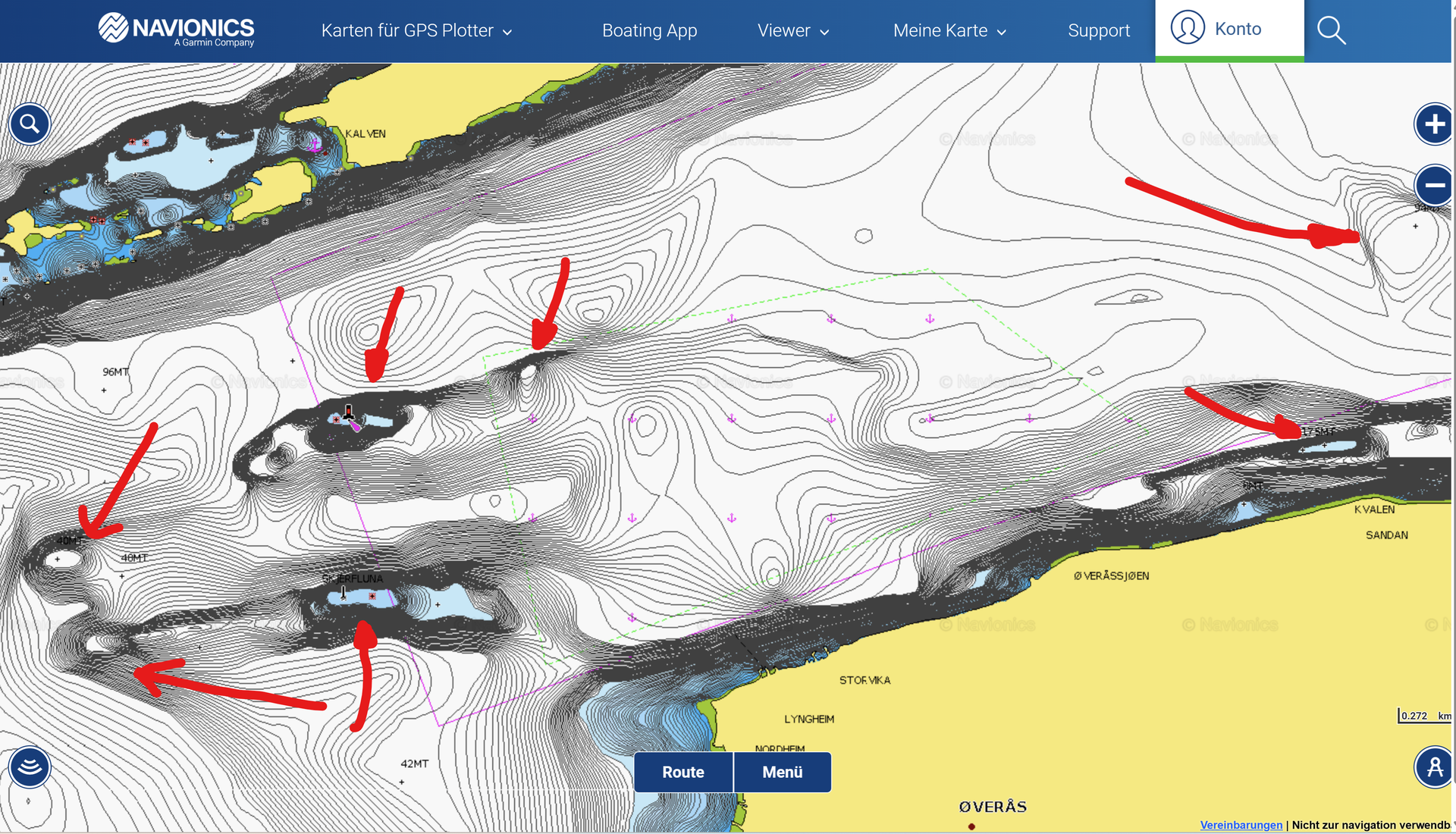 Seehecht? Aus dem Hafen raus rechts, kommt in zirka 500 meter ein abgeholztes Waldstück. Da gegenüber auf der 70 Meter Linie