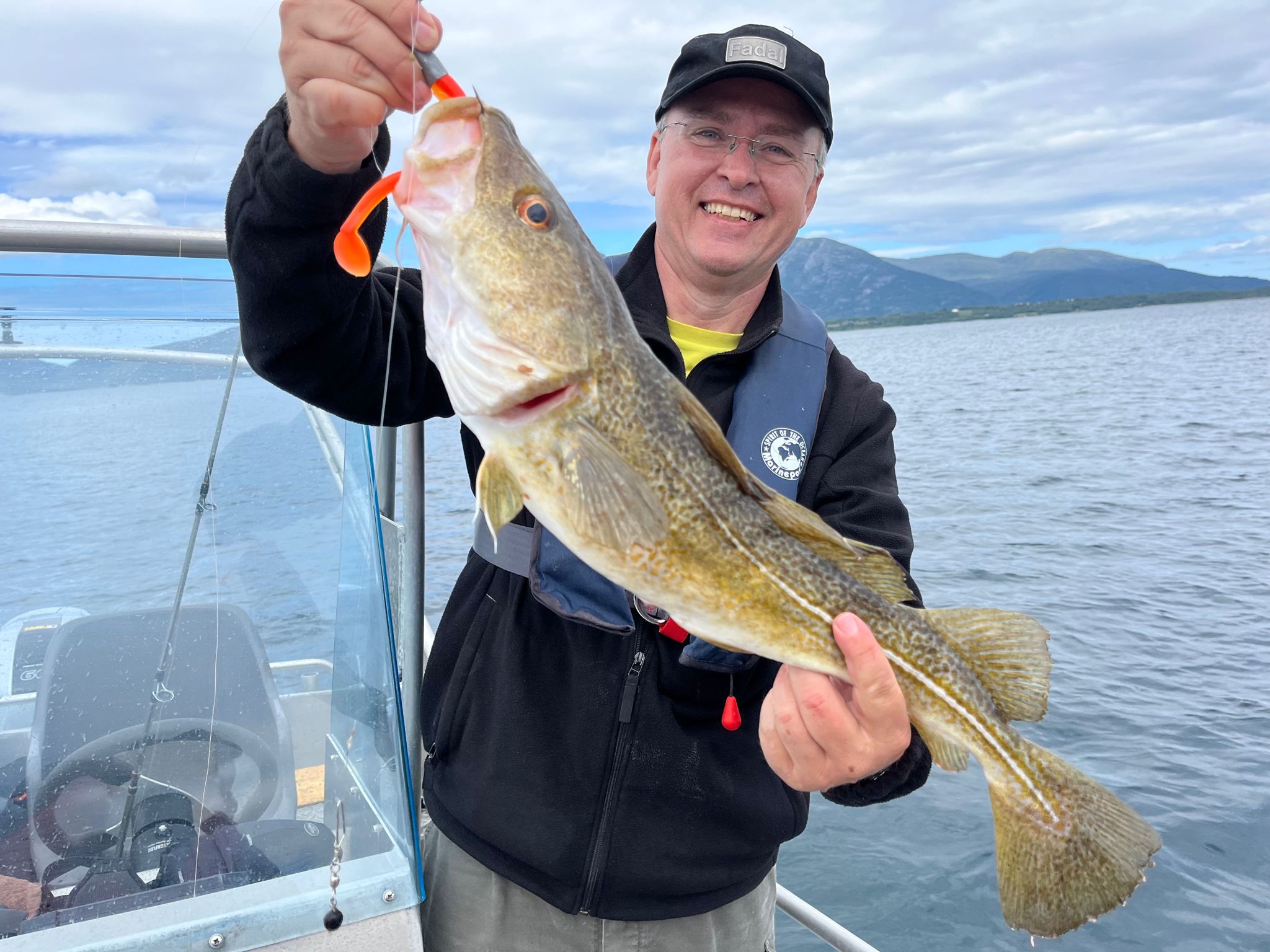 Danach sind wir ins Flachwassergebiet an der Ecke Tomrefjord/Midfjord gefahren, da mein Frauchen gerne Dorsch fangen wollte. Also gesagt getan, mir ist ja auch nix besseres einfallen, haben wir die Pilker demontiert und auf Gummis mit 30-80g Köpfen umgestellt. Der Wind machte leichteres Fischen nur selten möglich. In einer Tiefe 10-20m hatte Frauchen nach 5 Minuten schon den ersten Dorsch am Band. Wir staunten nicht schlecht. Ingesamt erwischten wir dort in mehreren Driften 6 schöne Dorsche, auch ich hatte einen: