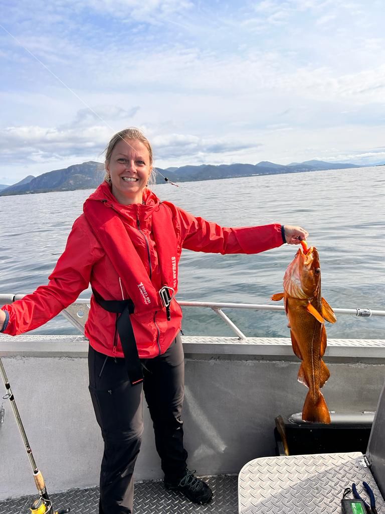 Wir blieben noch rund eine Stunde vor Ort, sahen einen Seeotter der scheinbar dort wohnt, aber es kam nichts mehr zählbares hinzu. Da der Wind aus Ost kam, entschlossen wir uns, uns hinter Tautra nach Westen driften zu lassen. Die Drift war ca. 1-1,5kn, d.h. ganz leichte Pilker nur noch mit Wurf in die Andrift möglich. Versucht haben wir es im flachen (40-50m) im tieferen (100m) und über ganz tiefen 140-170m Wasser. Aber es sollte noch nicht sein. Wir haben dann mehrmals umgesetzt, bis wir ungefähr an der Stelle von gestern waren, also Westspitze von Tautra, wo die Inselchen beginnen. Über 140m sagte ich noch „Signal auf 54m,“ dann schlug es bei meiner Frau schon ein. Zwei Sekunden später war auch meine Rute krum, allerdings nach 15 Sekunden wieder gerade, wech war er. Mein Frauchen kurbelte währenddessen einen schönen 70er Seelachs nach oben. Ich lies meinen Pilker nochmal durchsacken und der „Kollege“ entschied sich nun doch fürs Aufzug fahren. Einen Doppeldrill hatten wir auch noch nicht…