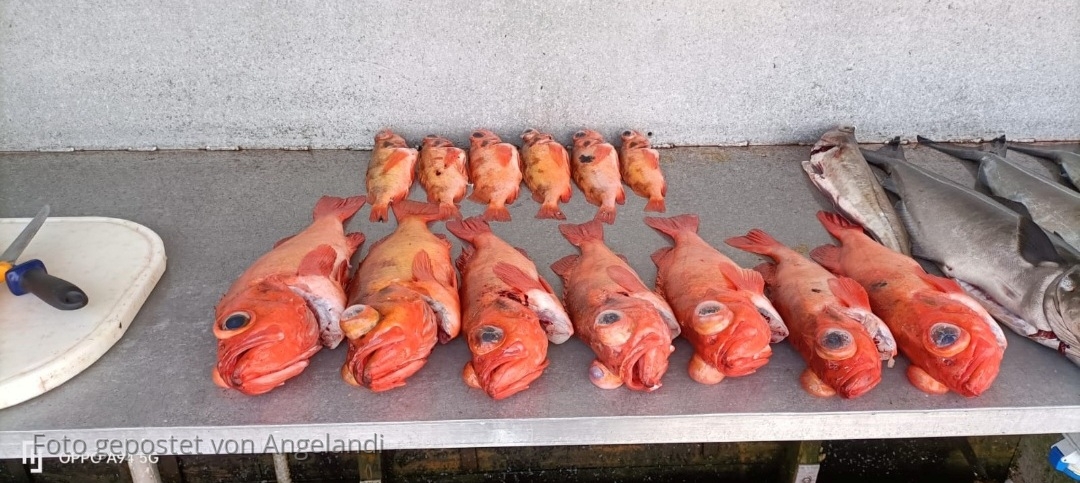 Dennoch füllte sich so nach und nach die Gefriertruhe (immer bedenken; das Erreichen der Ausfuhrquote sollte kein Muß sein) … und außer Pollacks konnten auch mittlere Köhler, Dorsche, Seehechte und Rotbarsche geangelt werden.