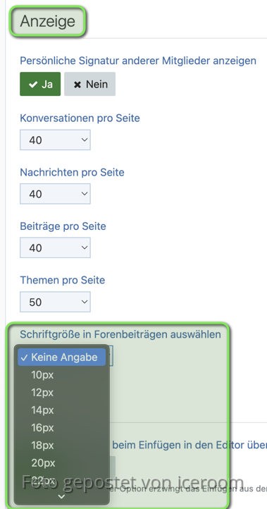 Im Bereich "Anzeige" befindet sich nun der Eintrag " Schriftgröße in Forenbeiträgen auswählen".