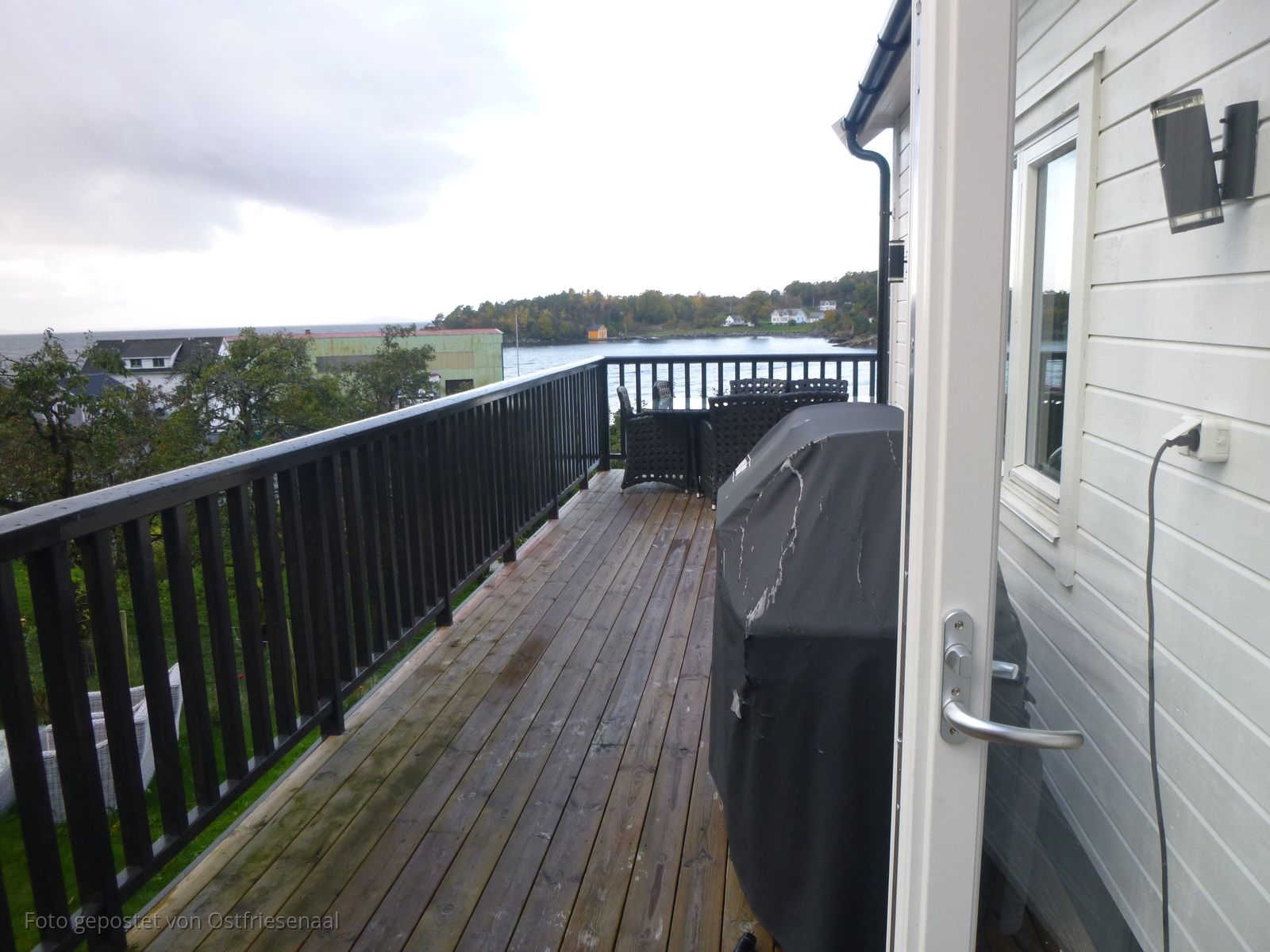 Um die Wohnung herum ist ansonsten eine schöne Terasse, die von Küche und Esszimmer zugänglich ist und einen tollen Ausblick bietet, wenn man von der Fabrik absieht (die aber auch interessant sein kann, wenn man sich dafür interessiert). Auf der Terasse ist auch ein Gasgrill und ein Holzkohlegrill und für "Viel-Griller" stellt Dag auch eine zweite Gasflasche dahin. Sitzgelegenheiten sind auch vorhanden.