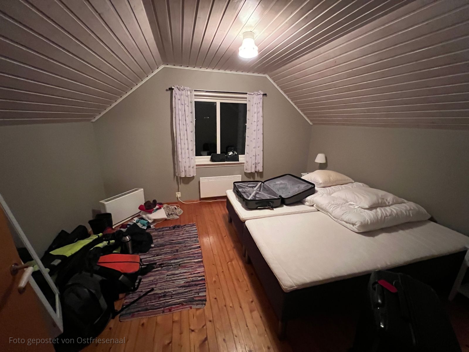 Sowohl im Erdgeschoss als auch im Obergeschoss sind je 2 Schlafzimmer mit je zwei Betten und Schrank. Elektroheizungen sind dort auch zu finden, wpdurch einem auch in kalter Nacht nicht kalt wird. Allerdings ist das Haus gut isoliert und wir mussten eher die Fenster öffnen, um nicht zu zerfließen. Das gilt übrigens für die ganze Wohnung, die sehr schnell warm wurde, wenn wir die Heizungen anschmissen.