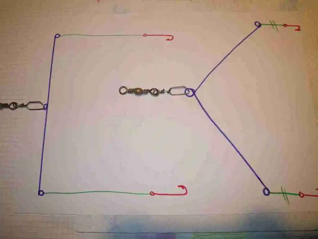 2 oder mehrere Haken am Montageende: ich würde dazu rostfreien Federstahldraht nehmen und kurze Monofilvorfächer mit Haken. -