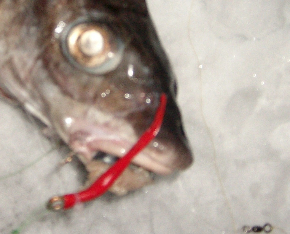 Ist ja nicht die Regel, dass ich mit Kraken als Køder angel. Wenn ich aber ne Krake habe, dann kommt sie - sofern sie nicht zu gross ist - komplett an ein System mit einem 10/0 Drilling unten, und einem 10 - 12/0 Einzelhaken (tragend) obend. Der Drilling hængt lose zwischen den Fangarmen.