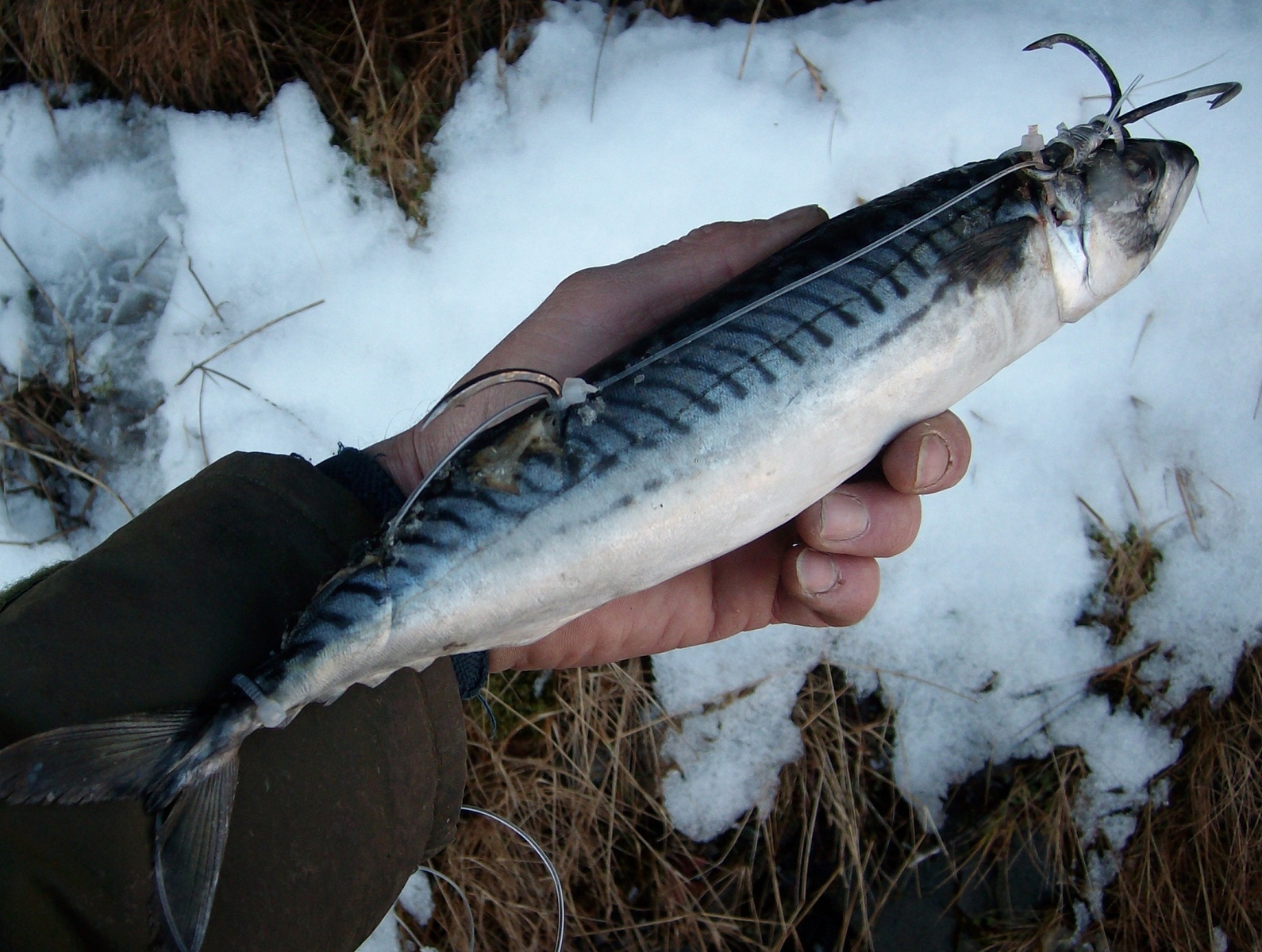 Zum anderen hab ich einige Makrelen (samt System) in mit Wasser gefuellte Plastiktueten gesteckt und draussen gefieren lassen. Lediglich das Vorfach bleibt draussen, um es nur noch mit einem Blei einzuhængen - und dann raustreiben zu lassen.