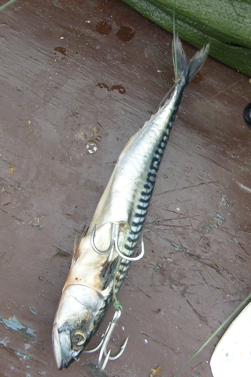 Man kønnte die Makrele auch andersrum auf die Haken ziehen. Denke mal, das Ergebnis wære dasselbe. Bisher hælt es sich ziemlich die Waage, was den Angriff ( Dorsch,Seehecht,Leng) von Vorne oder Hinten auf den Køderfisch betrifft. -