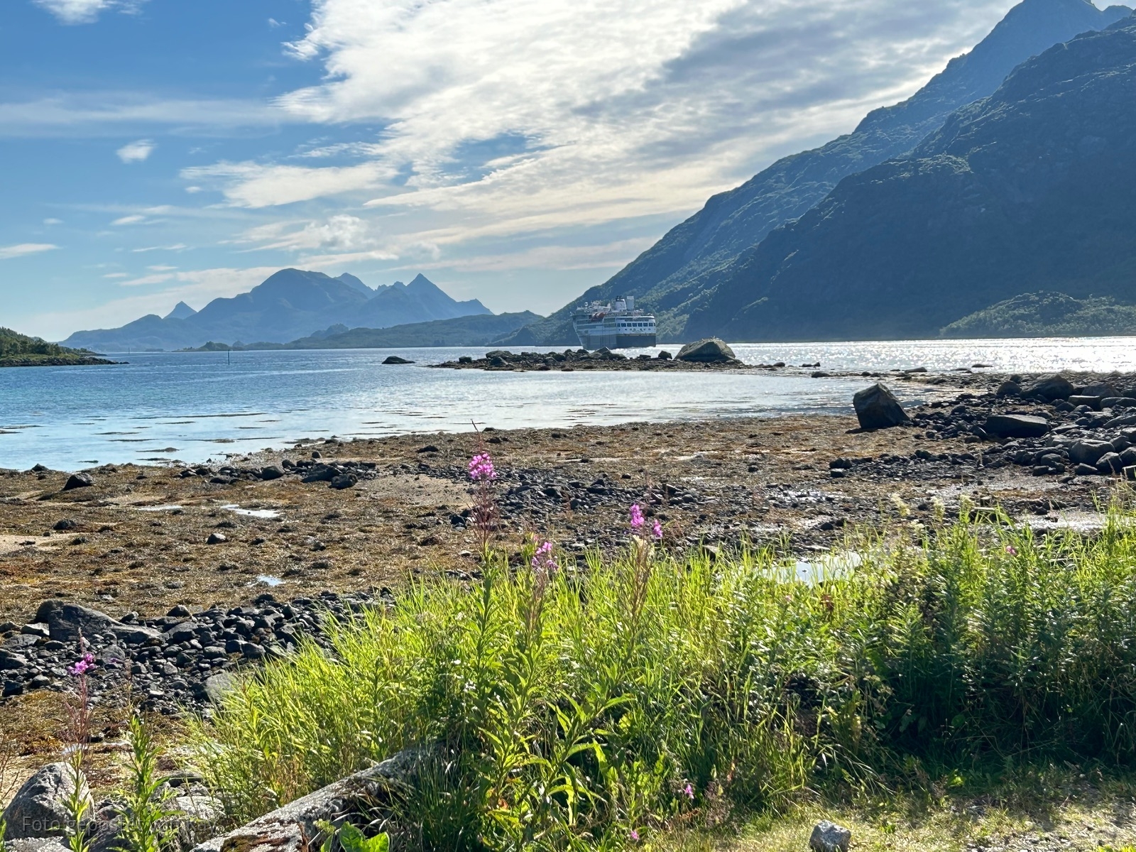 Heute etwas früher. Knapp 280 km waren es heute nur und wir sind kurz nach Mittag bei Raften Camping am Tengelfjord angekommen. Hier werden wir nächtigen und es heute ganz entspannt angehen. Wetter ist bestens und nachher wird gegrillt. Morgen dann geht es auf die Lofoten rauf. Habe schon einen Köderfisch-Pollack vom Ufer gefangen. Das Wasser ist hier aber so schön klar und karibisch gefärbt, das lädt eher zum Baden statt zum Angeln ein. Vielleicht habe ich nachher noch ein zwei Fotos für euch. Das hier gibt es jetzt schon mal gratis, da die Hurtigrute hier gerade durch den Fjord gekommen ist.